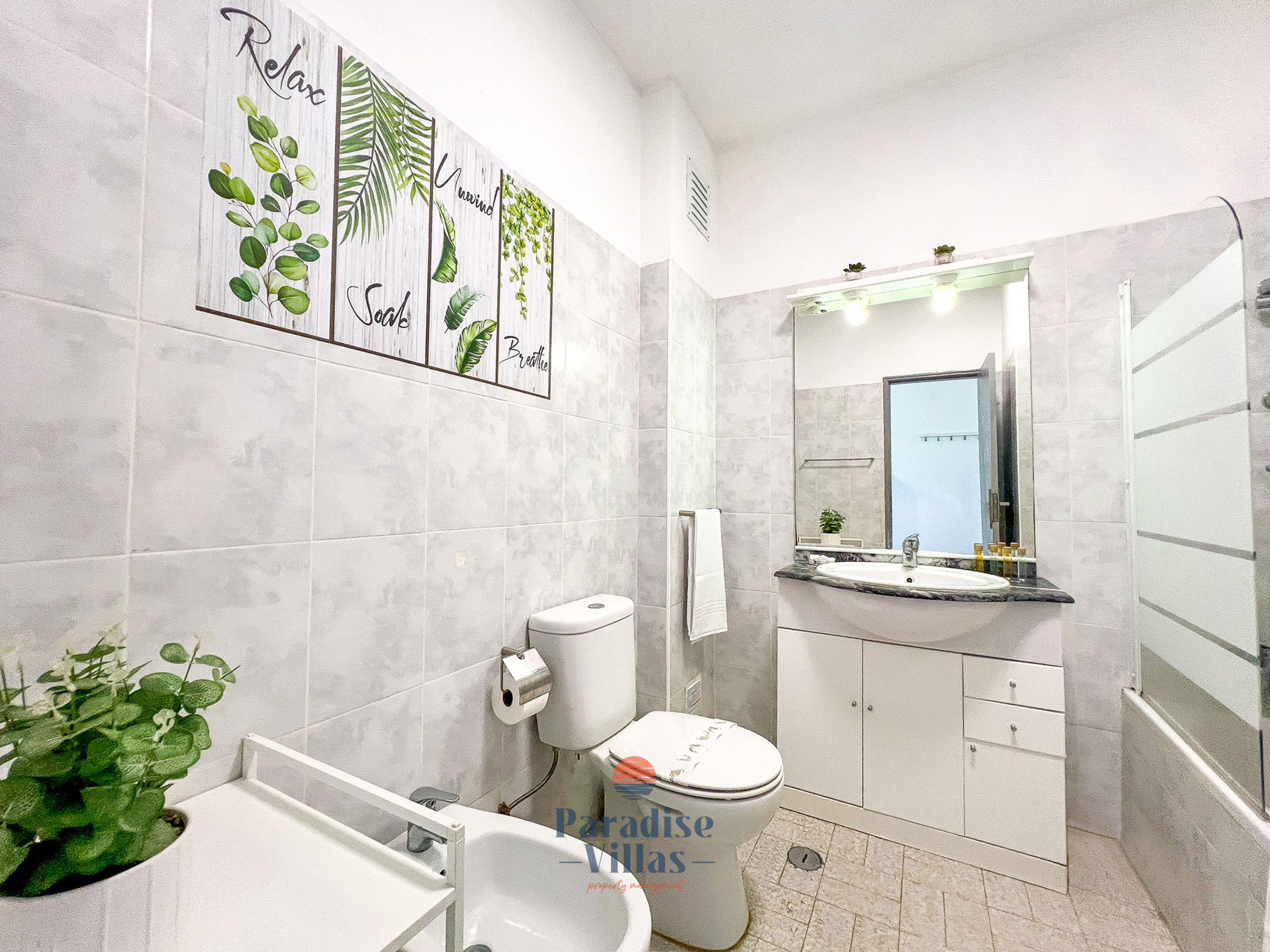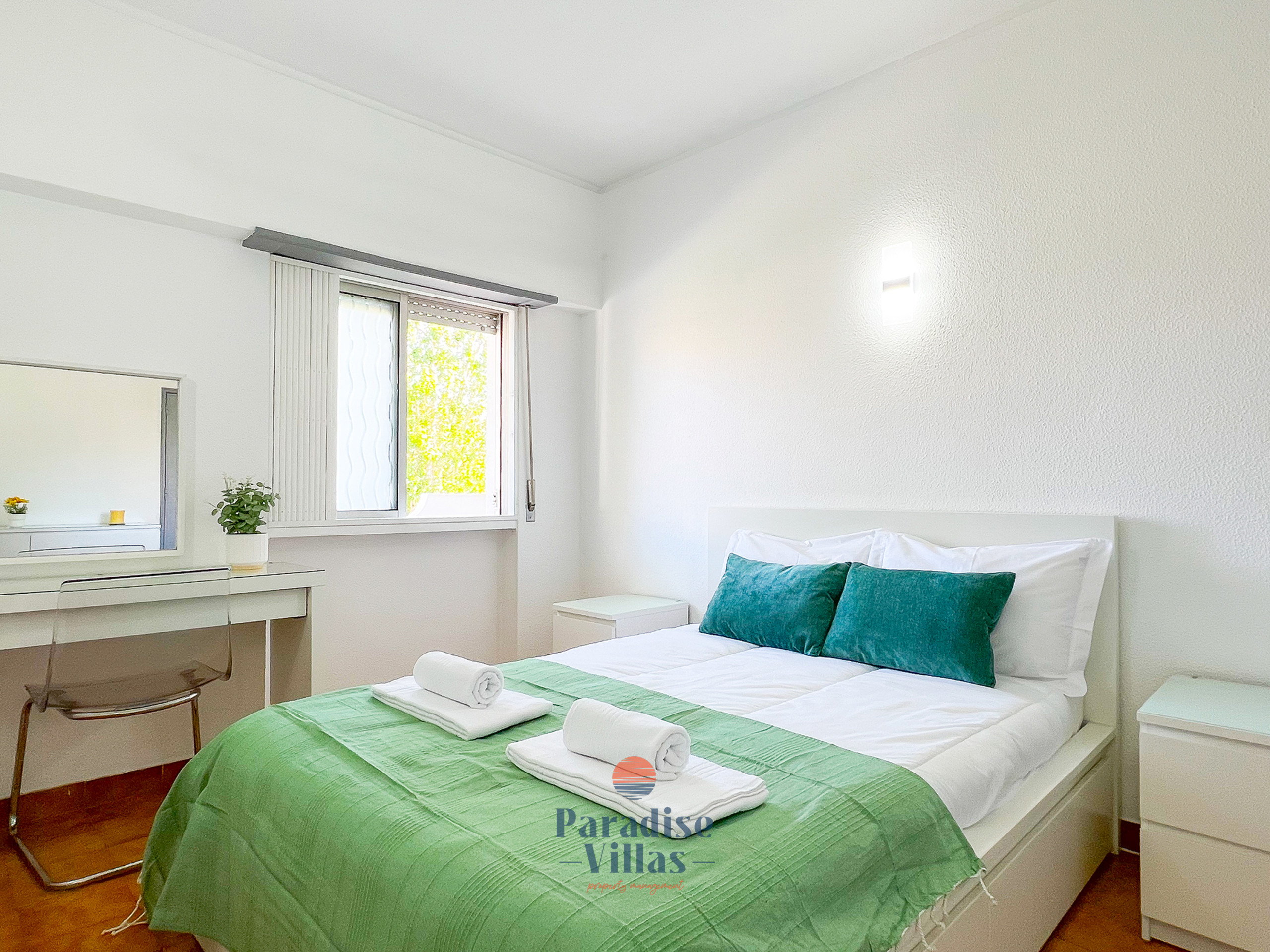 O quarto principal oferece total privacidade, com acesso à segunda varanda e uma casa de banho privativa. O segundo quarto, com duas camas individuais, também é luminoso e confortável, e existe uma segunda casa de banho completa com chuveiro.