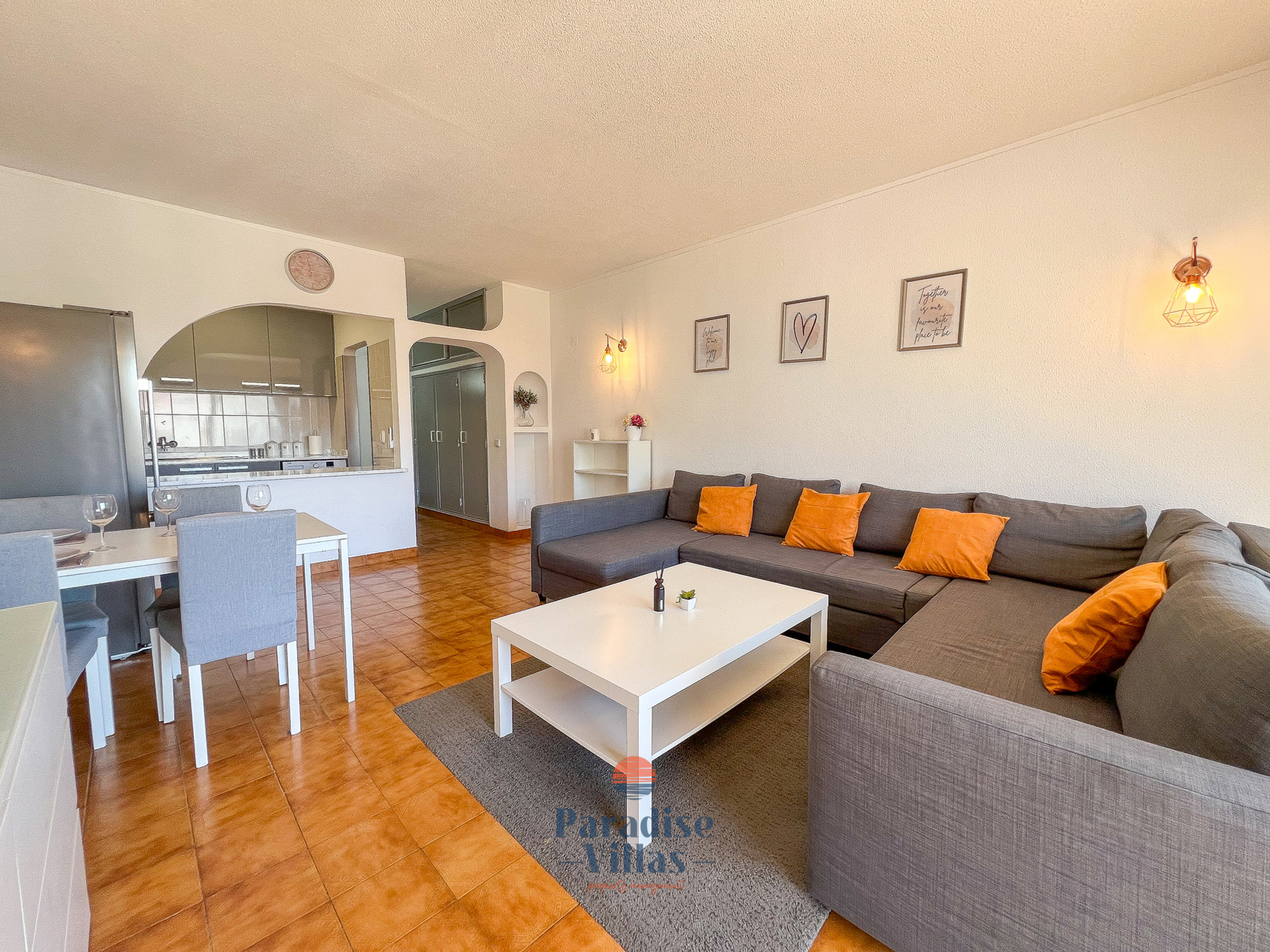 A sala de estar inclui um sofá confortável e uma televisão com canais internacionais, perfeito para relaxar após um dia na praia. A área de refeições integra-se harmoniosamente no espaço, criando o cenário ideal para refeições com família ou amigos, enquanto a cozinha totalmente equipada oferece tudo o que é necessário para uma estadia prática e confortável.