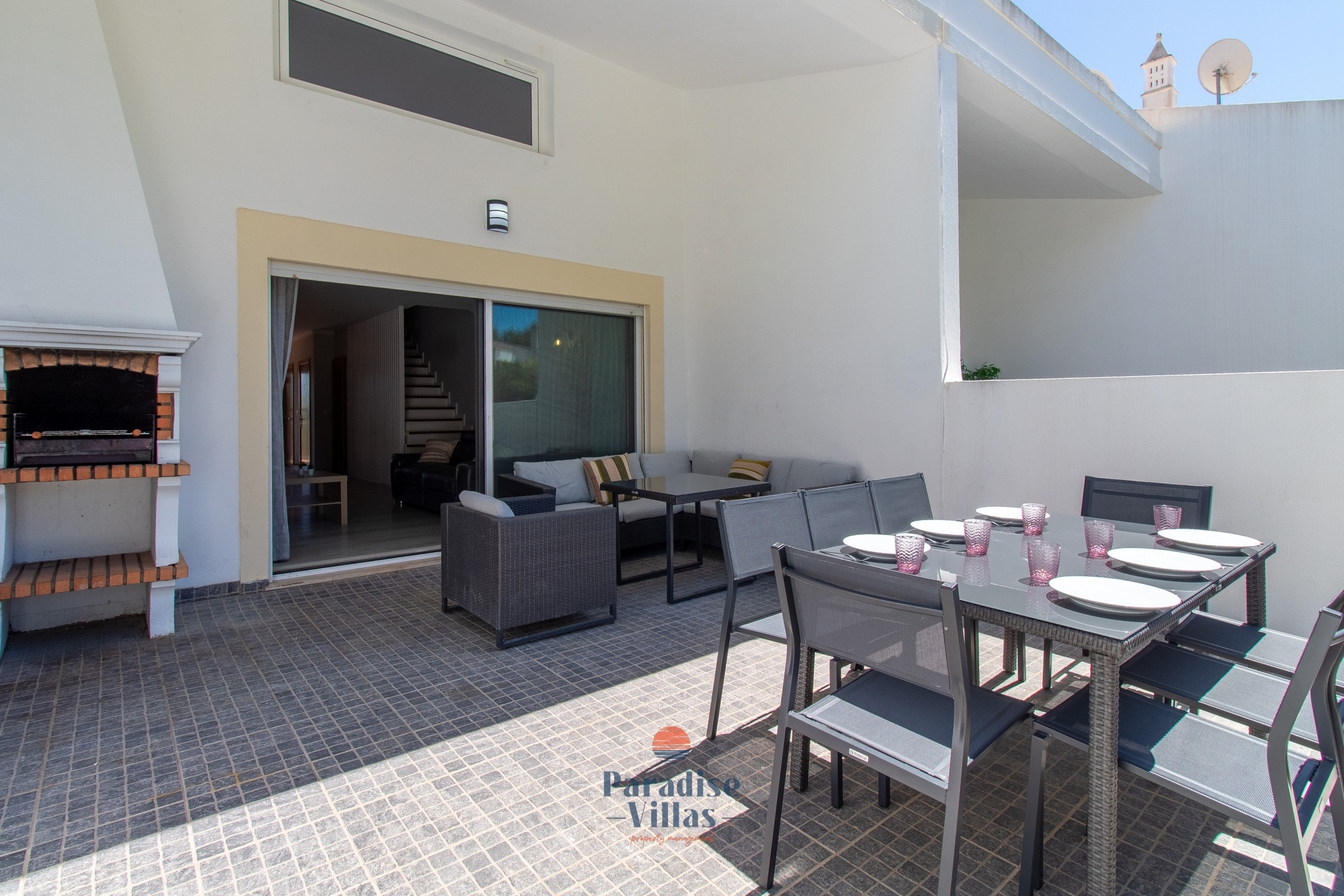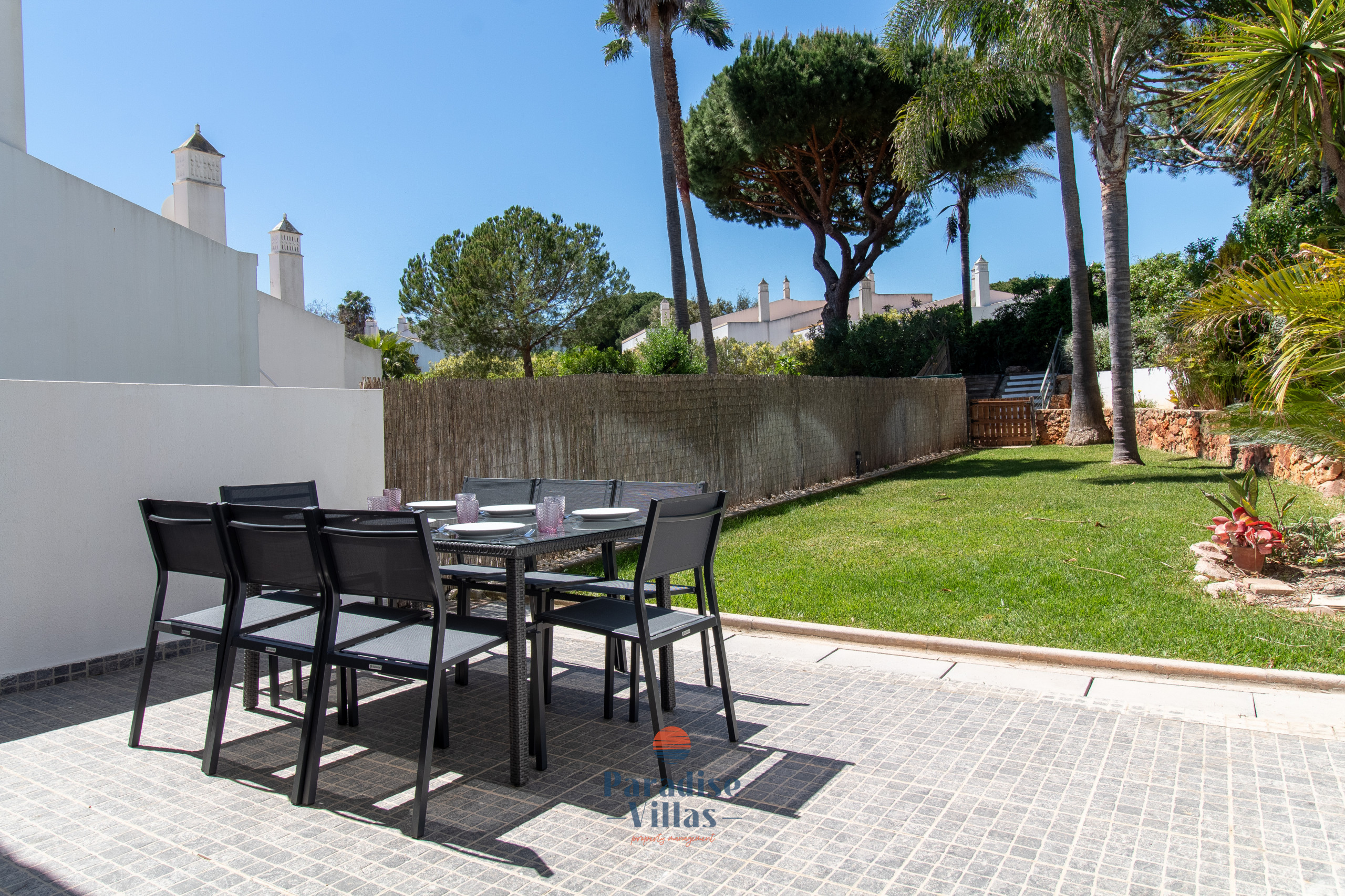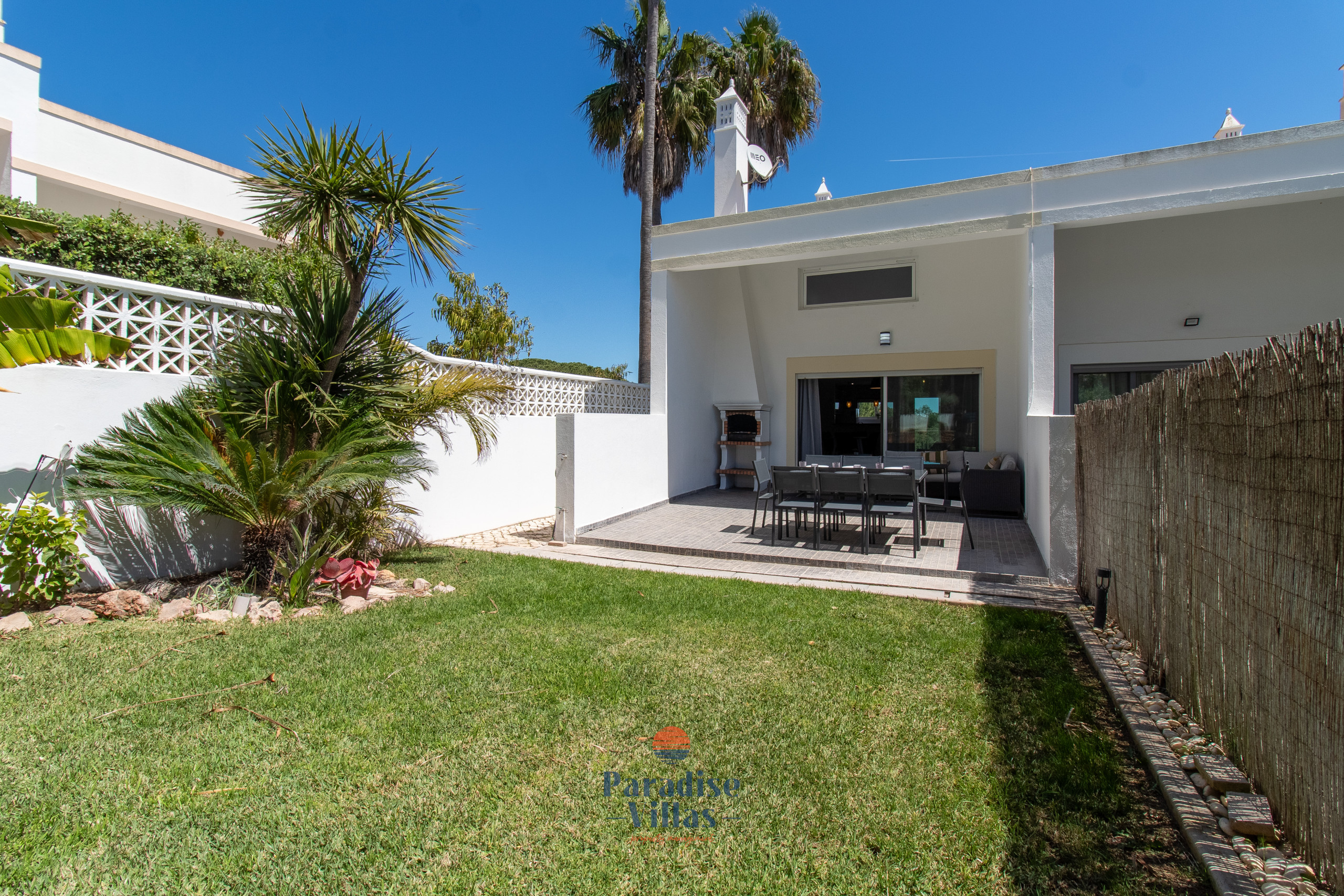 Lá fora, os hóspedes podem desfrutar de uma área de jardim privada com BBQ, mesa de refeições ao ar livre e um espaço de lounge confortável — ideal para momentos relaxantes em família após um dia na praia ou na piscina.