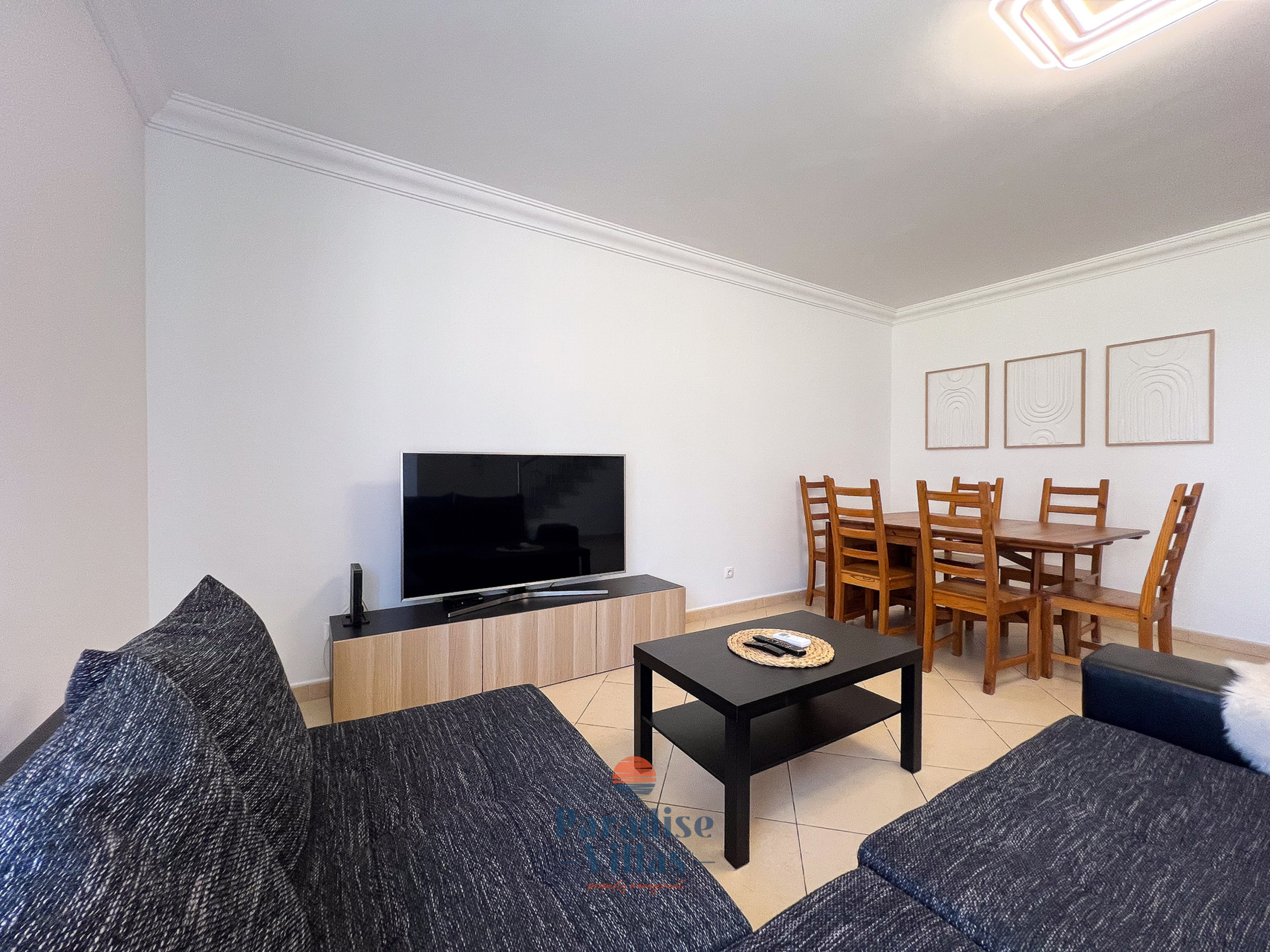 A sala de estar oferece um sofá grande e confortável e uma TV com canais internacionais, tornando-a o lugar perfeito para relaxar após um dia na praia.