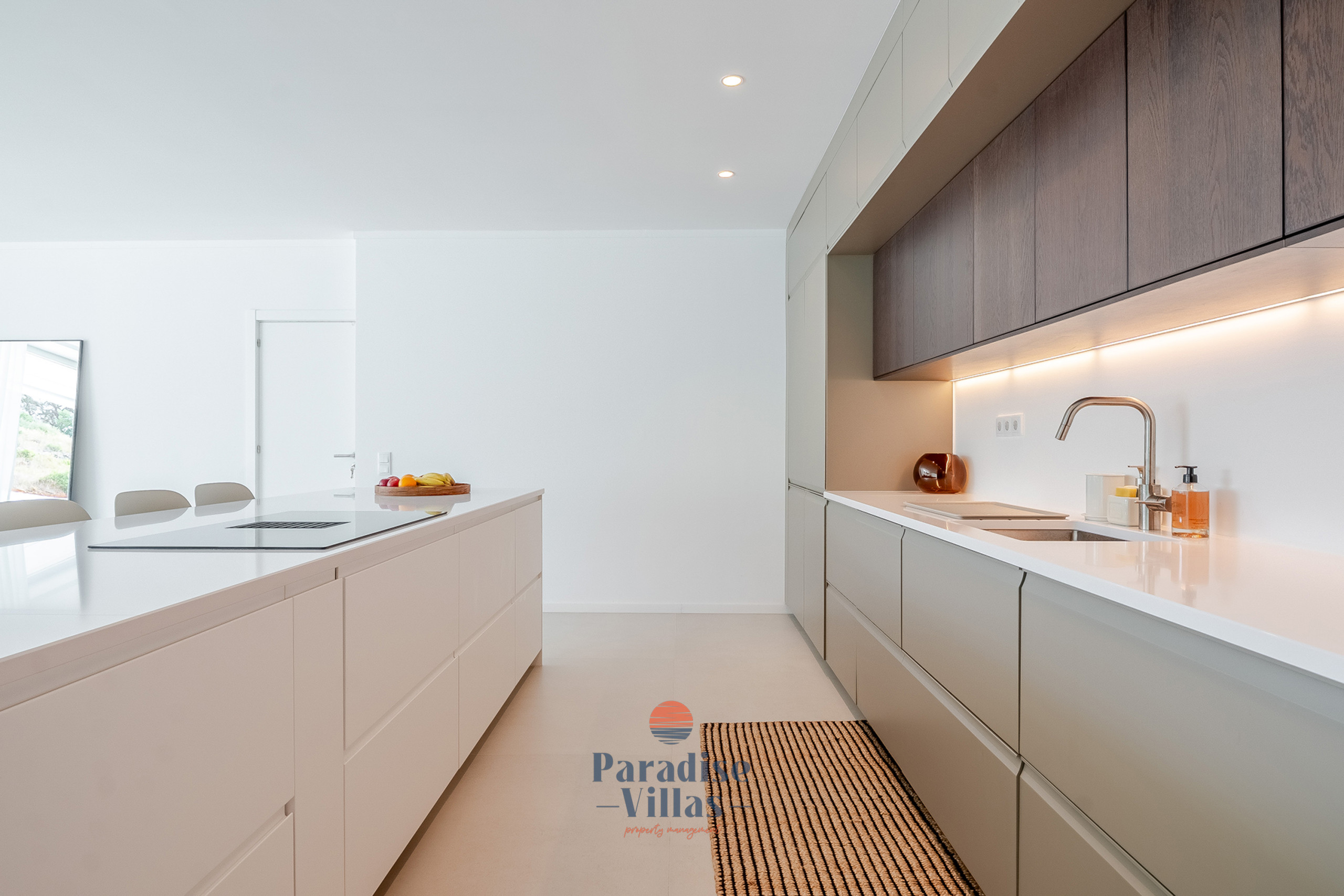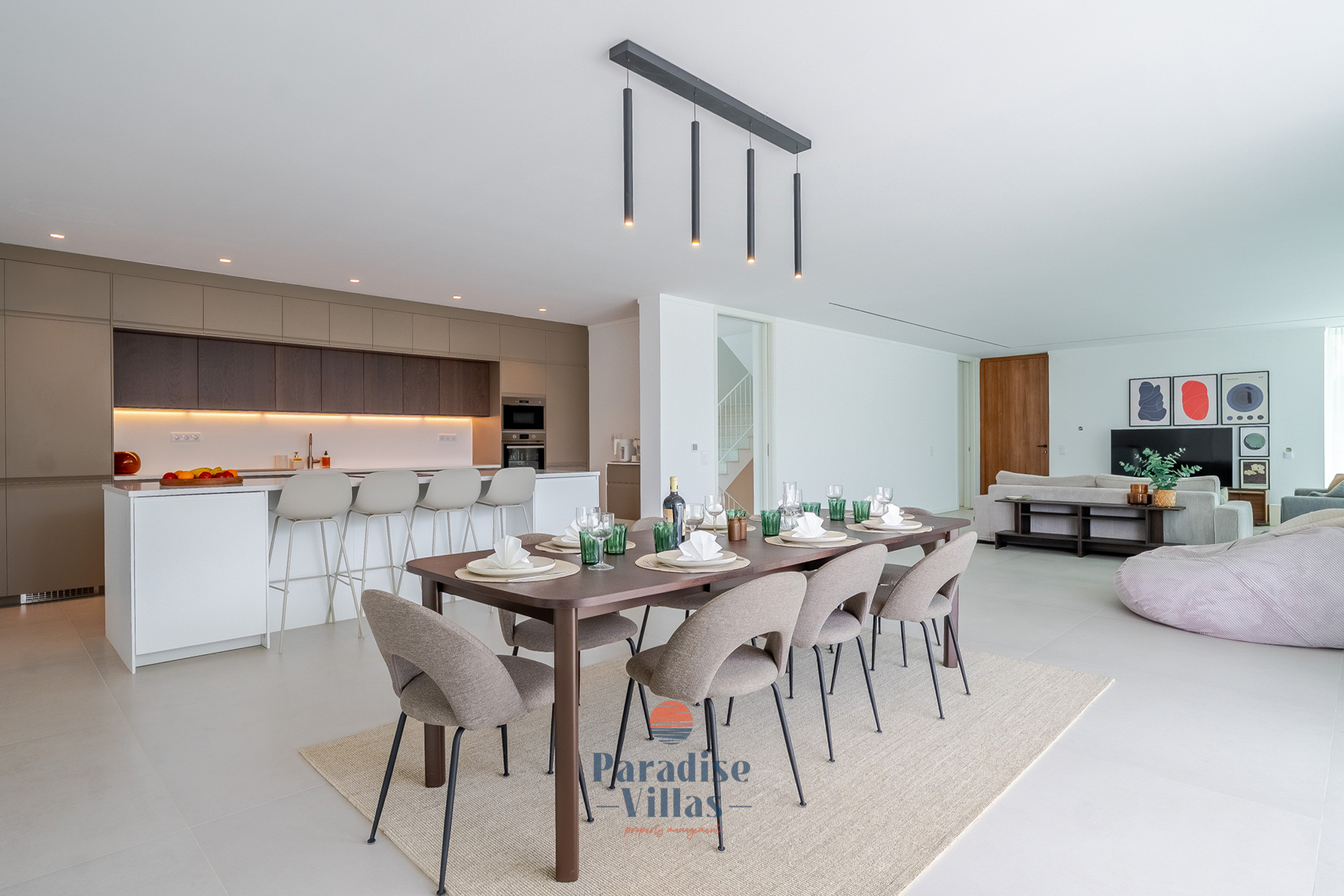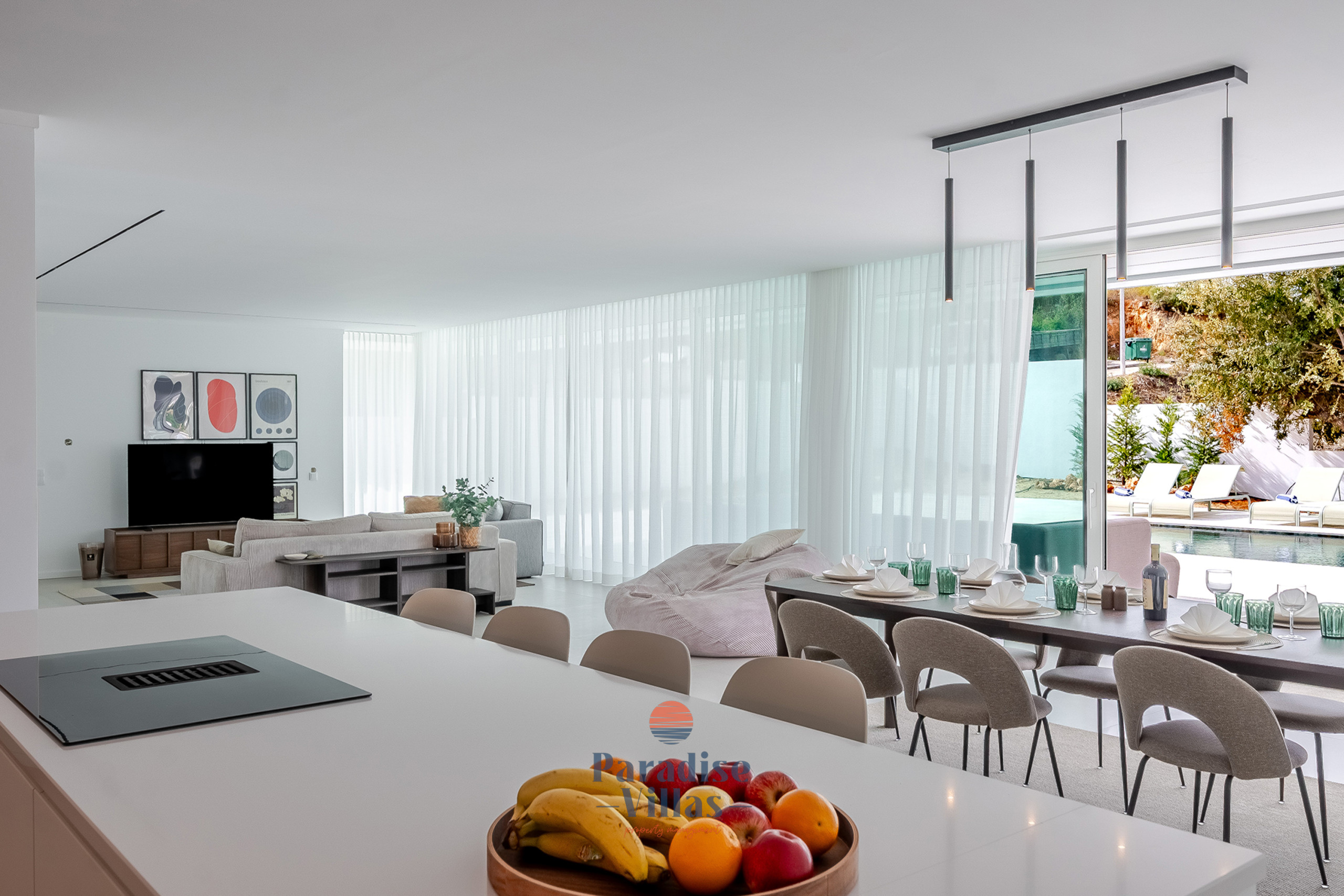 Desfrute de uma área de estar ampla com uma cozinha totalmente equipada e acesso direto ao terraço e à piscina infinita, perfeita para relaxar ou jantar ao ar livre.