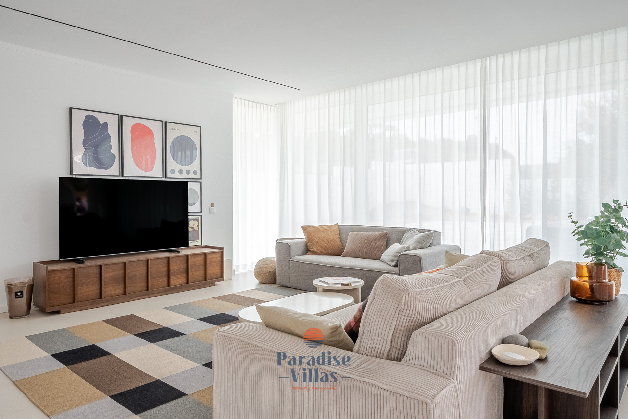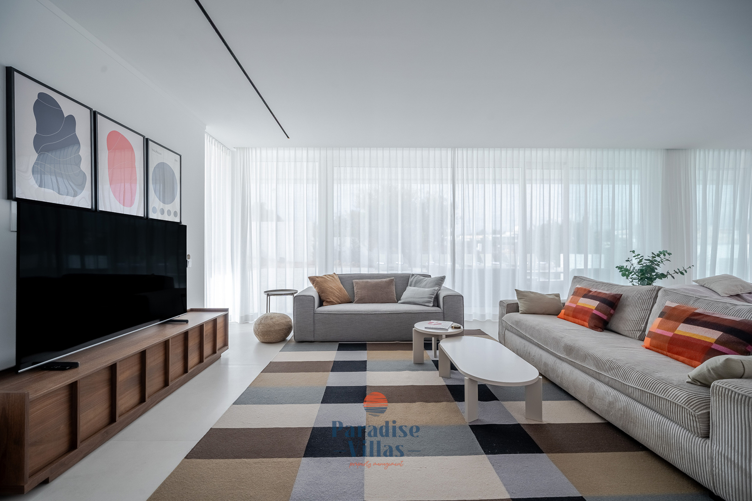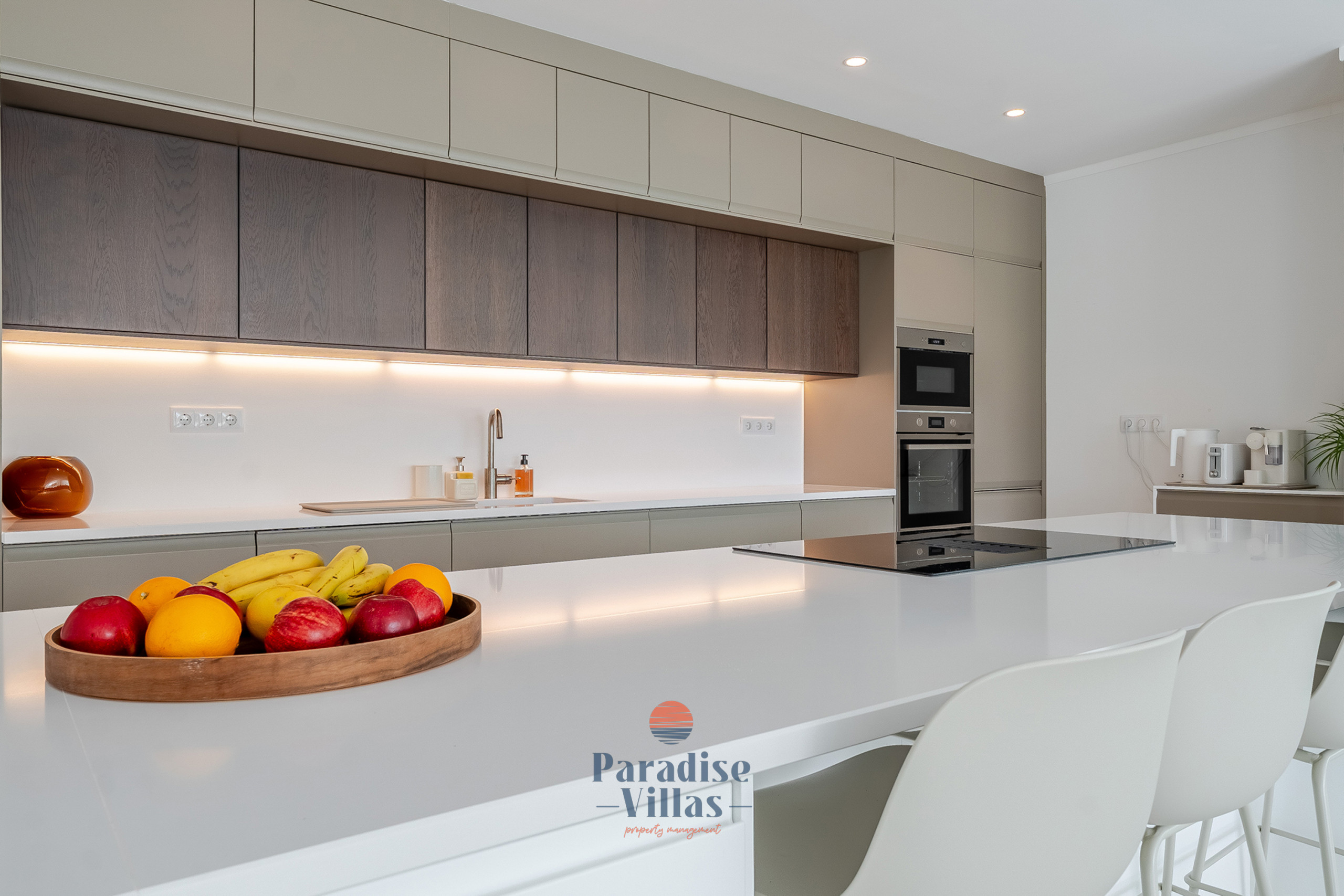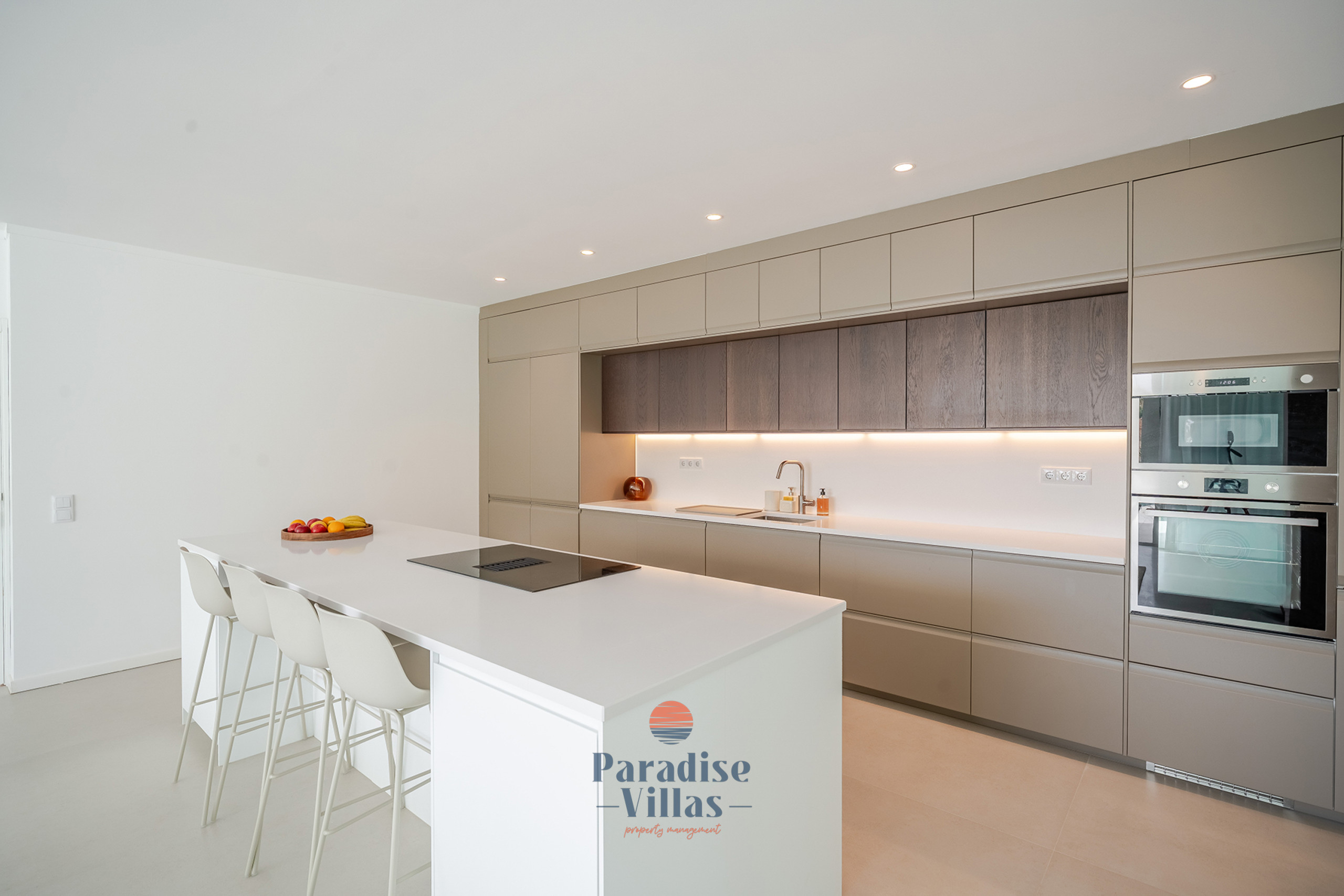 Desfrute de uma área de estar ampla com uma cozinha totalmente equipada e acesso direto ao terraço e à piscina infinita, perfeita para relaxar ou jantar ao ar livre.