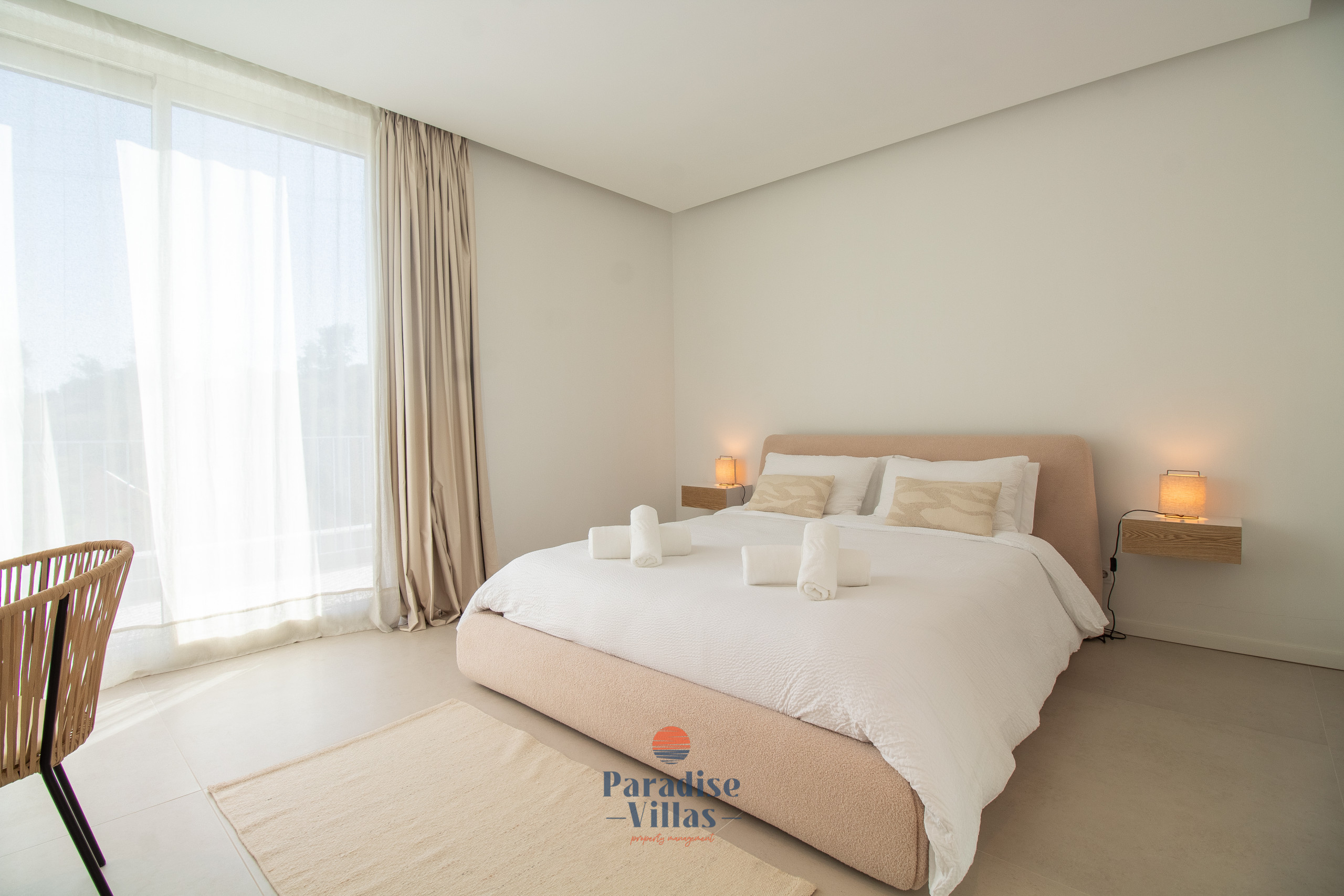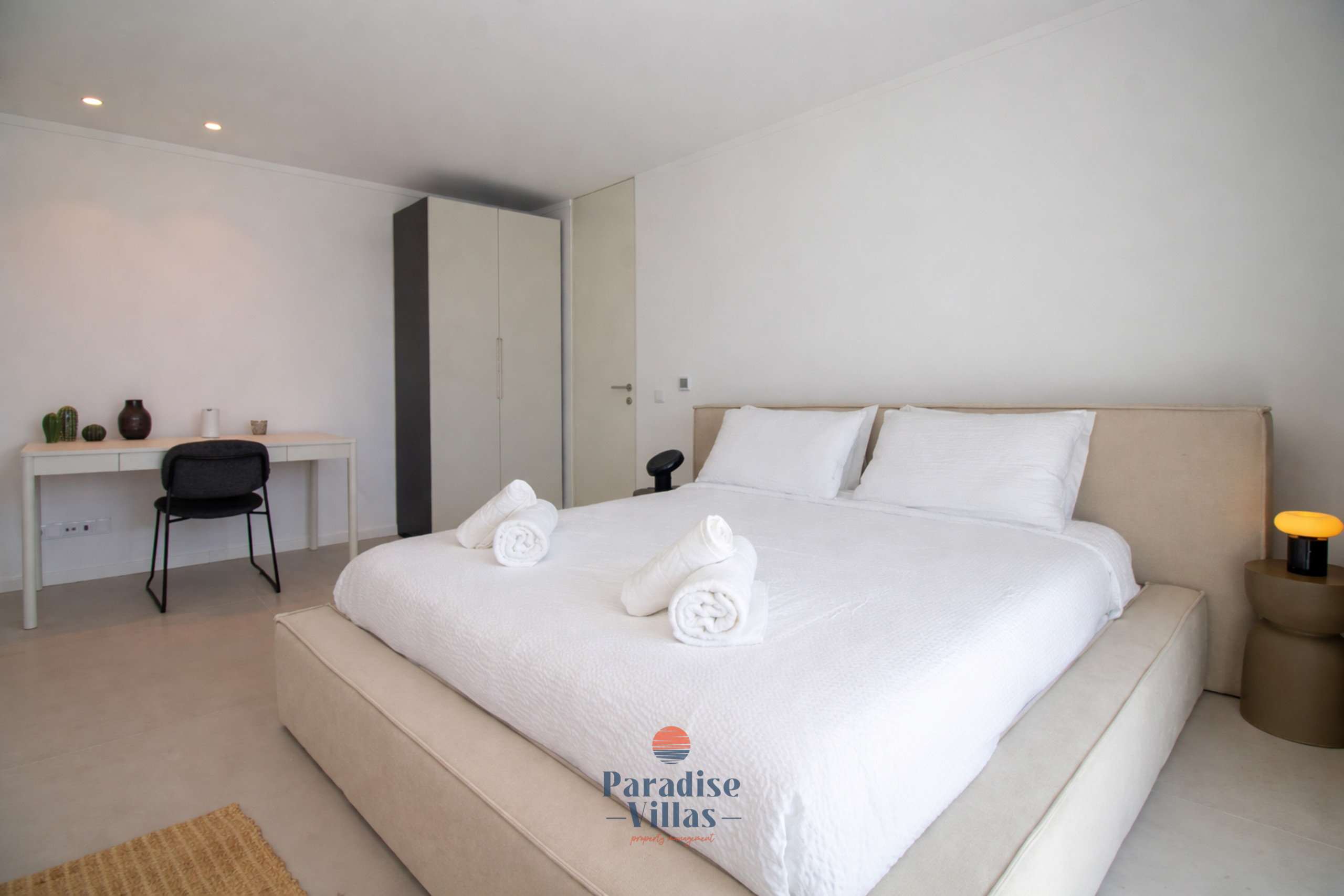 1 quarto duplo com casa de banho privada, vista para a piscina e acesso direto ao terraço;