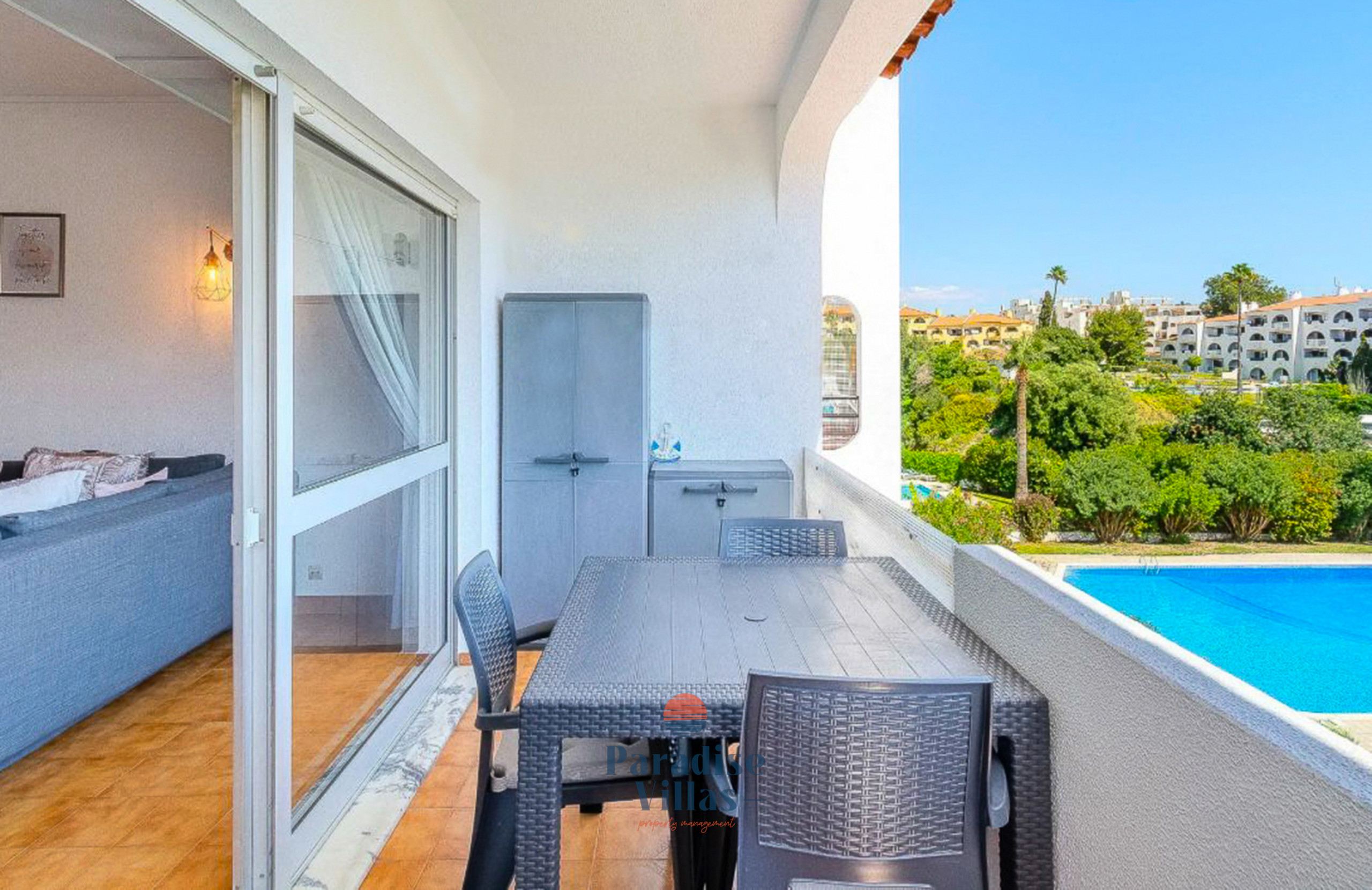One of its highlights is the balcony, furnished with an outdoor table and offering a pleasant view of the swimming pool.