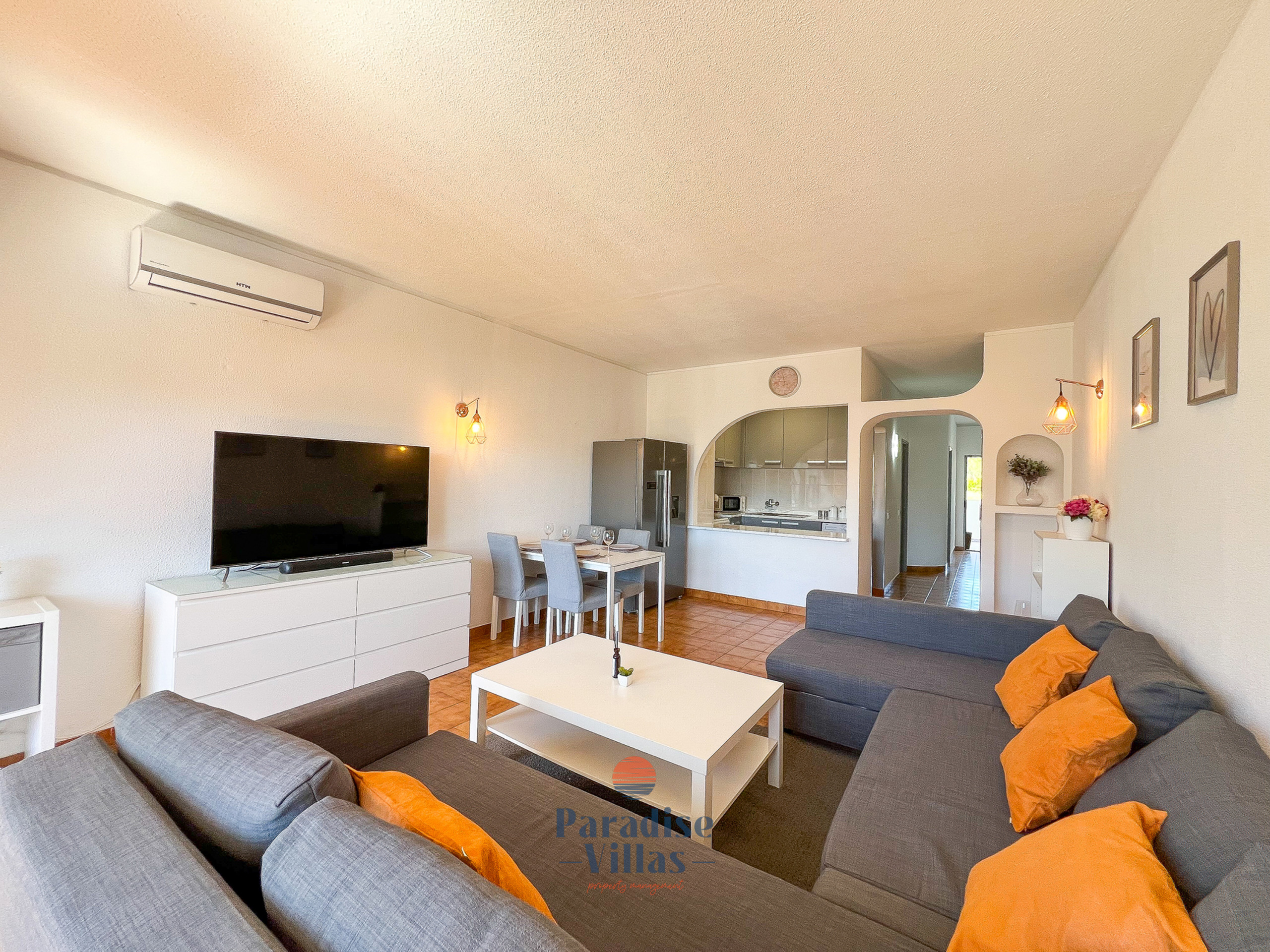 The open-plan living room and kitchen are designed for relaxation and practicality, featuring a 55-inch Smart TV and high-speed internet.