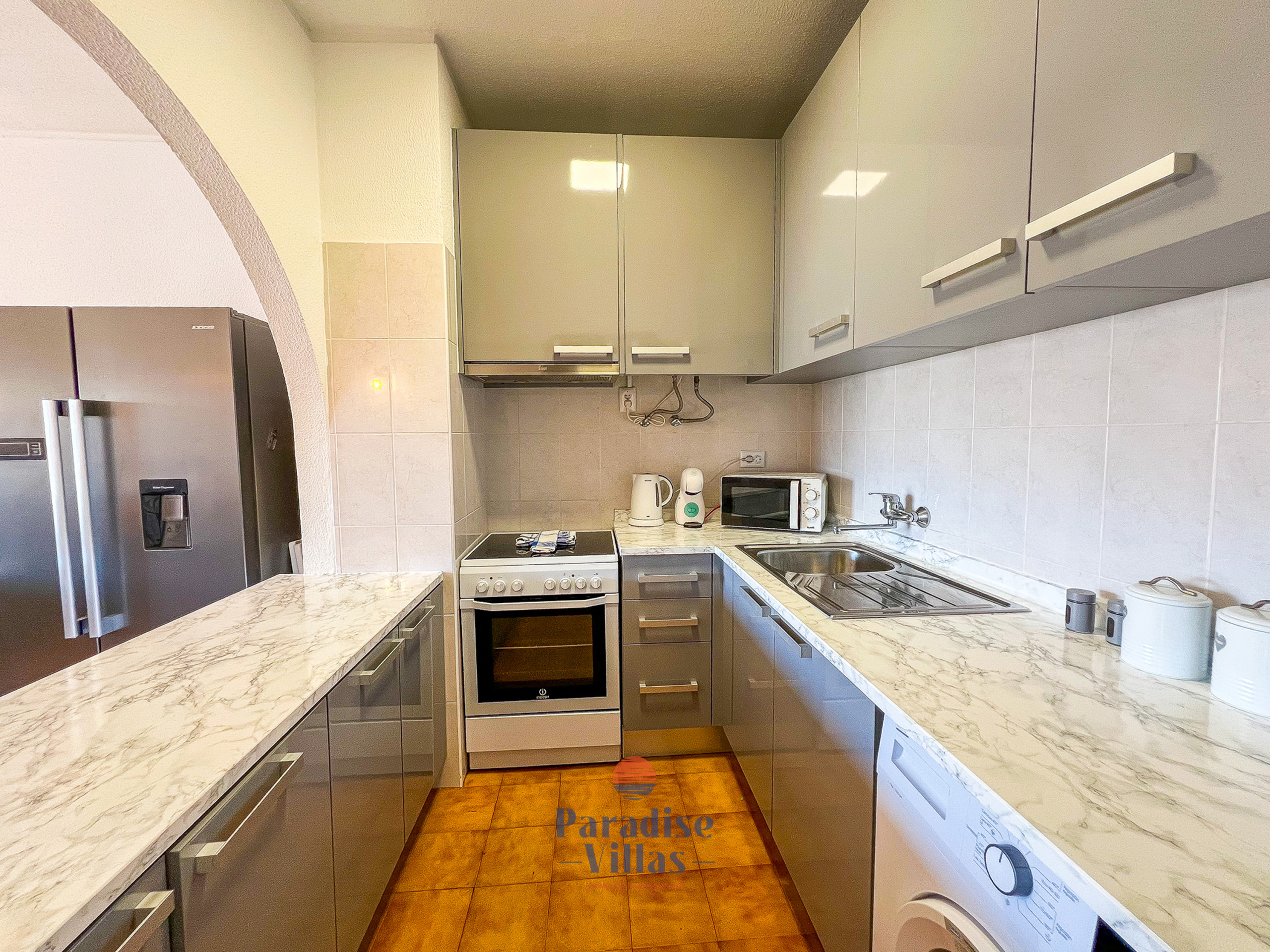 The open-plan kitchen is fully equipped to ensure comfort and convenience throughout your stay.