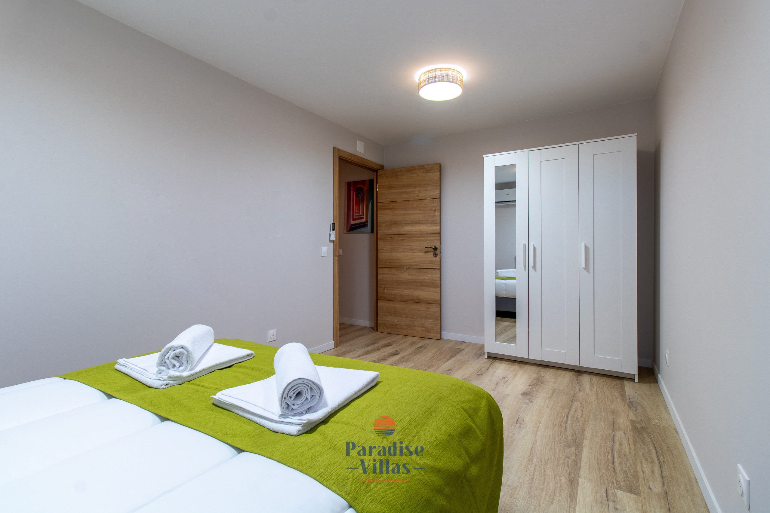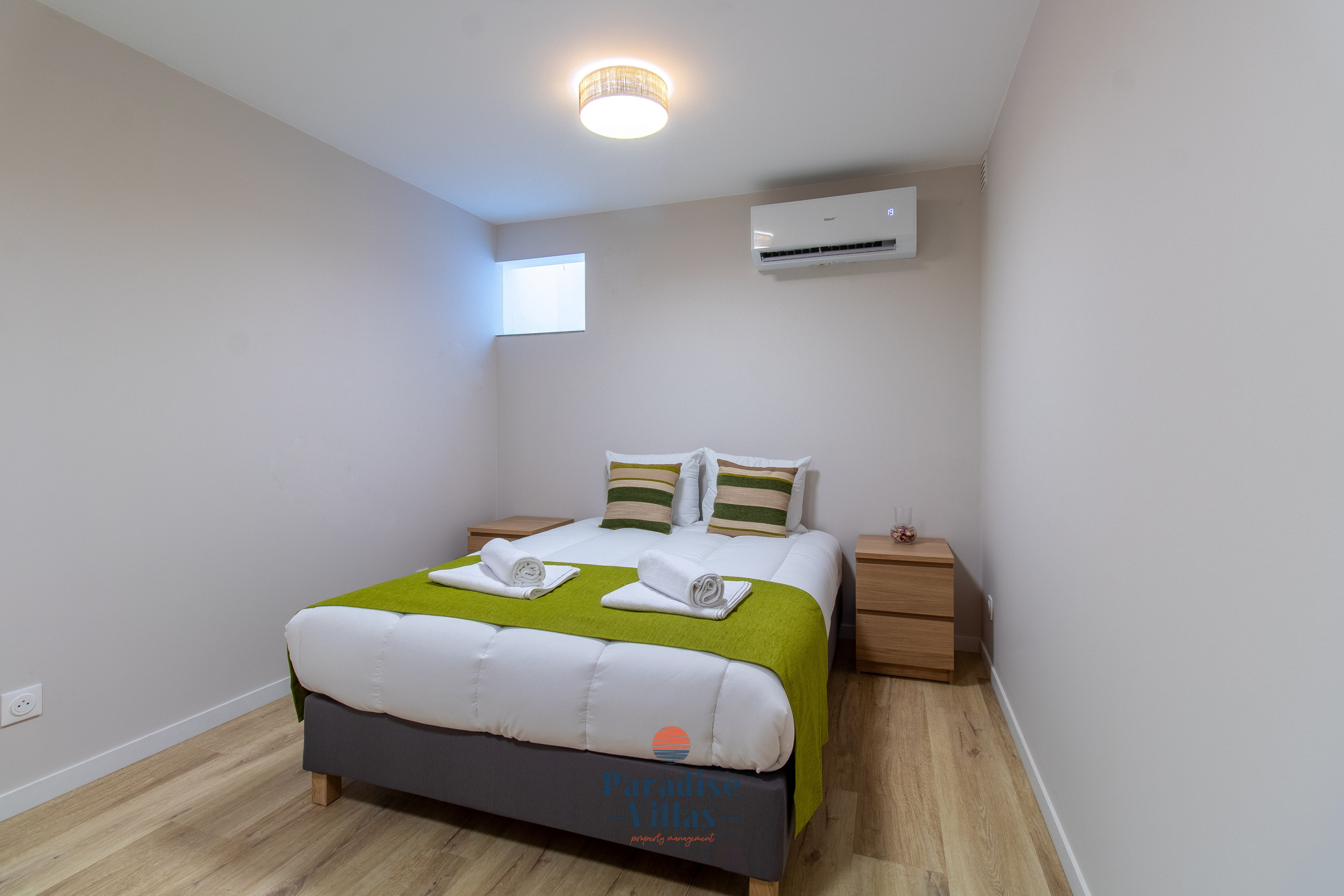 On the lower floor there is a third bedroom with a double bed and an additional bathroom.