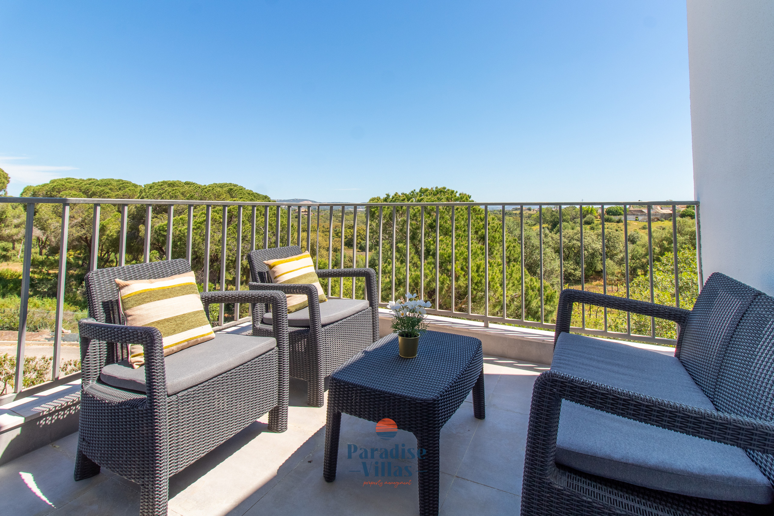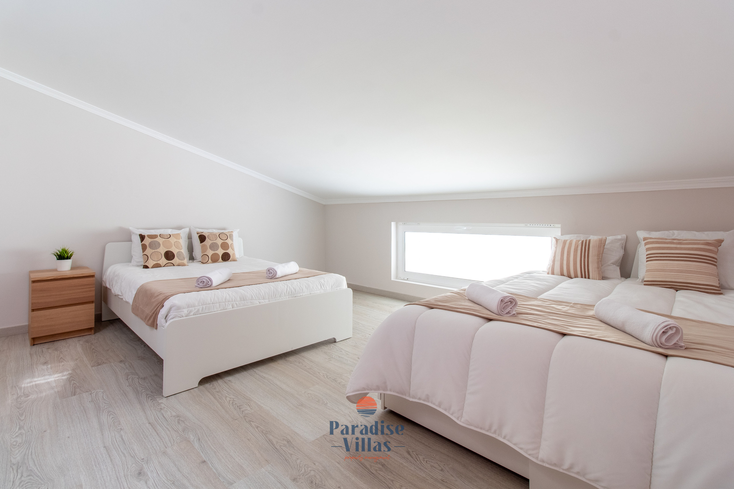 The first-floor features two bedrooms: one with a double bed and a balcony with a comfortable lounge area, and another with two double beds, as well as a bathroom.