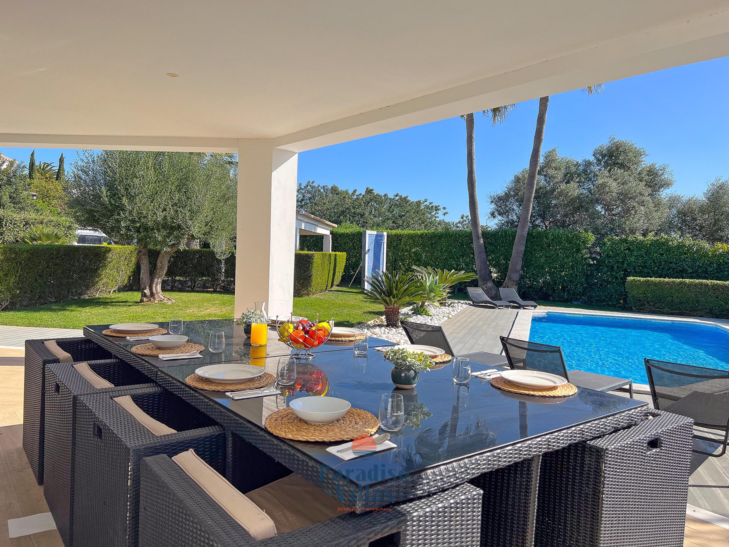 Outside, you will find a large private swimming pool surrounded by sun loungers, comfortable outdoor seating, and a dining table—perfect for enjoying meals al fresco.