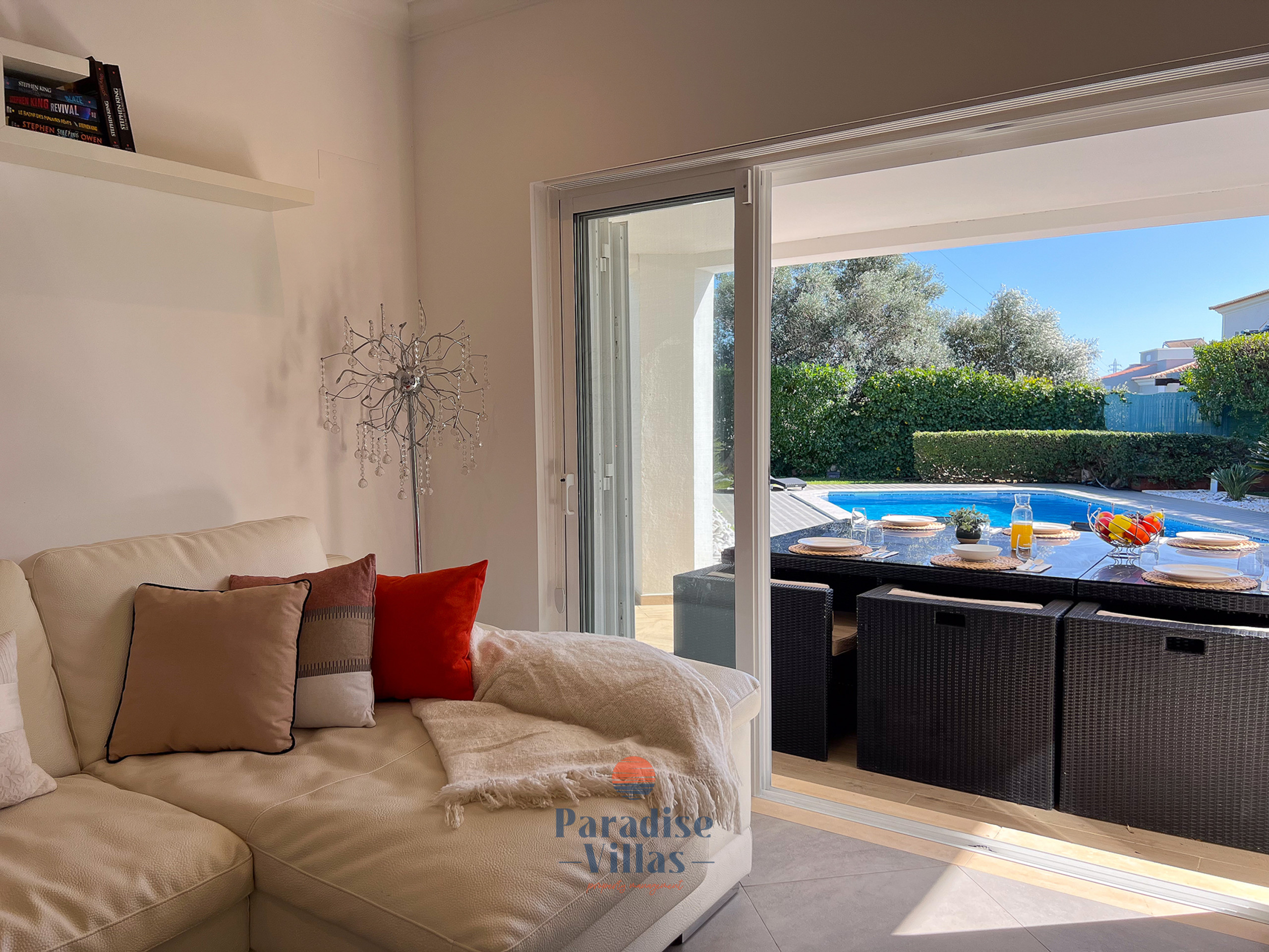 The open-plan living and dining areas are filled with natural light thanks to large windows that frame lovely views of the garden and swimming pool.