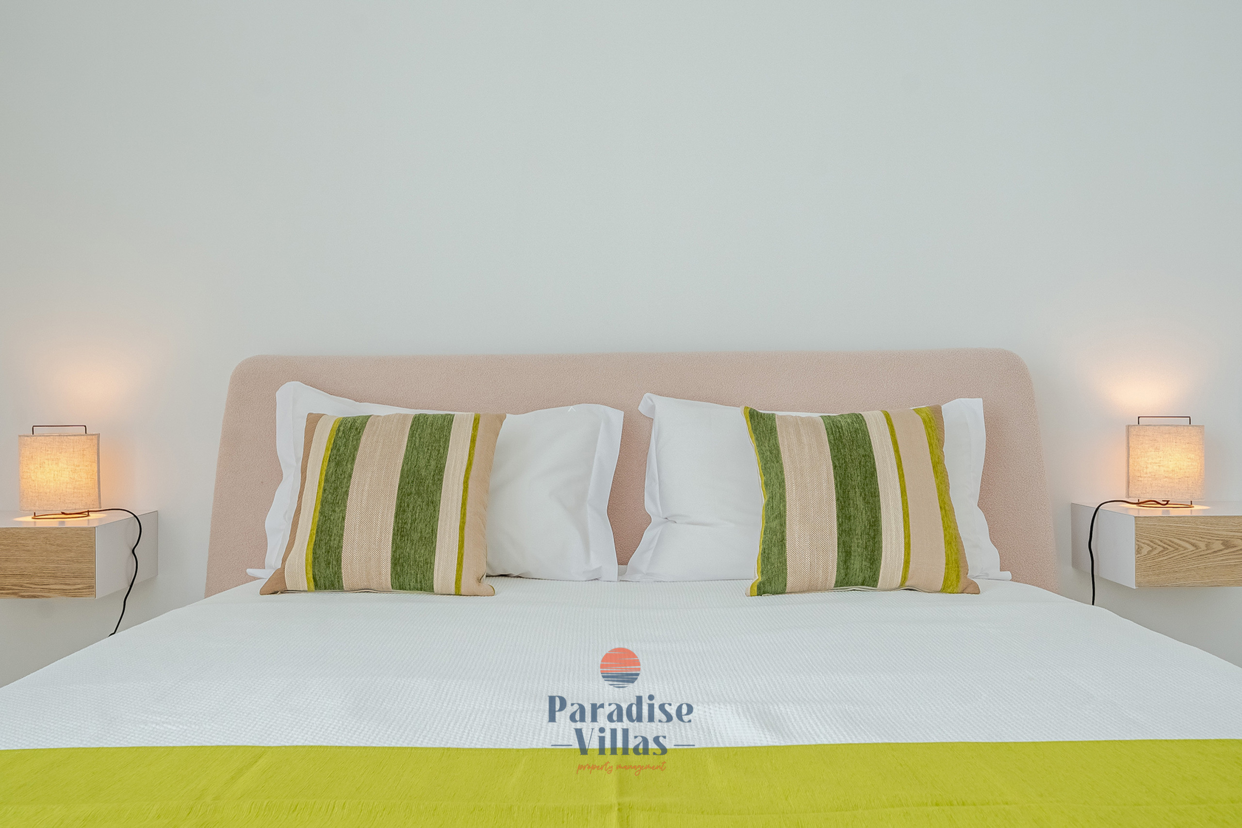 1 double ensuite bedroom with a king bed, private bathroom, pool view, and direct access to the terrace;