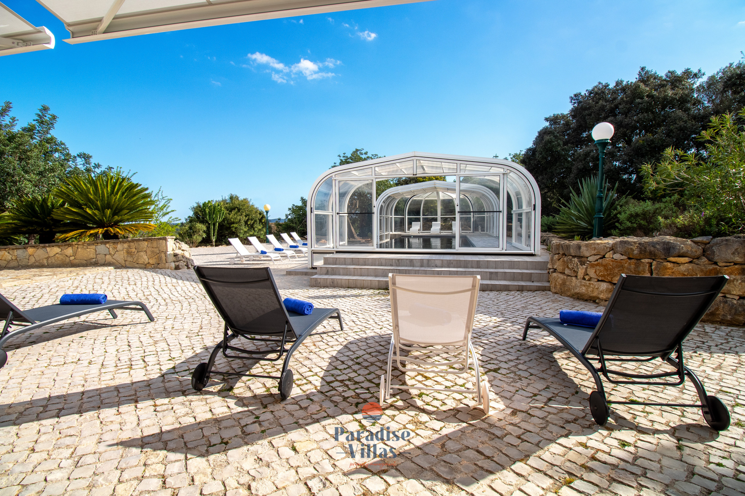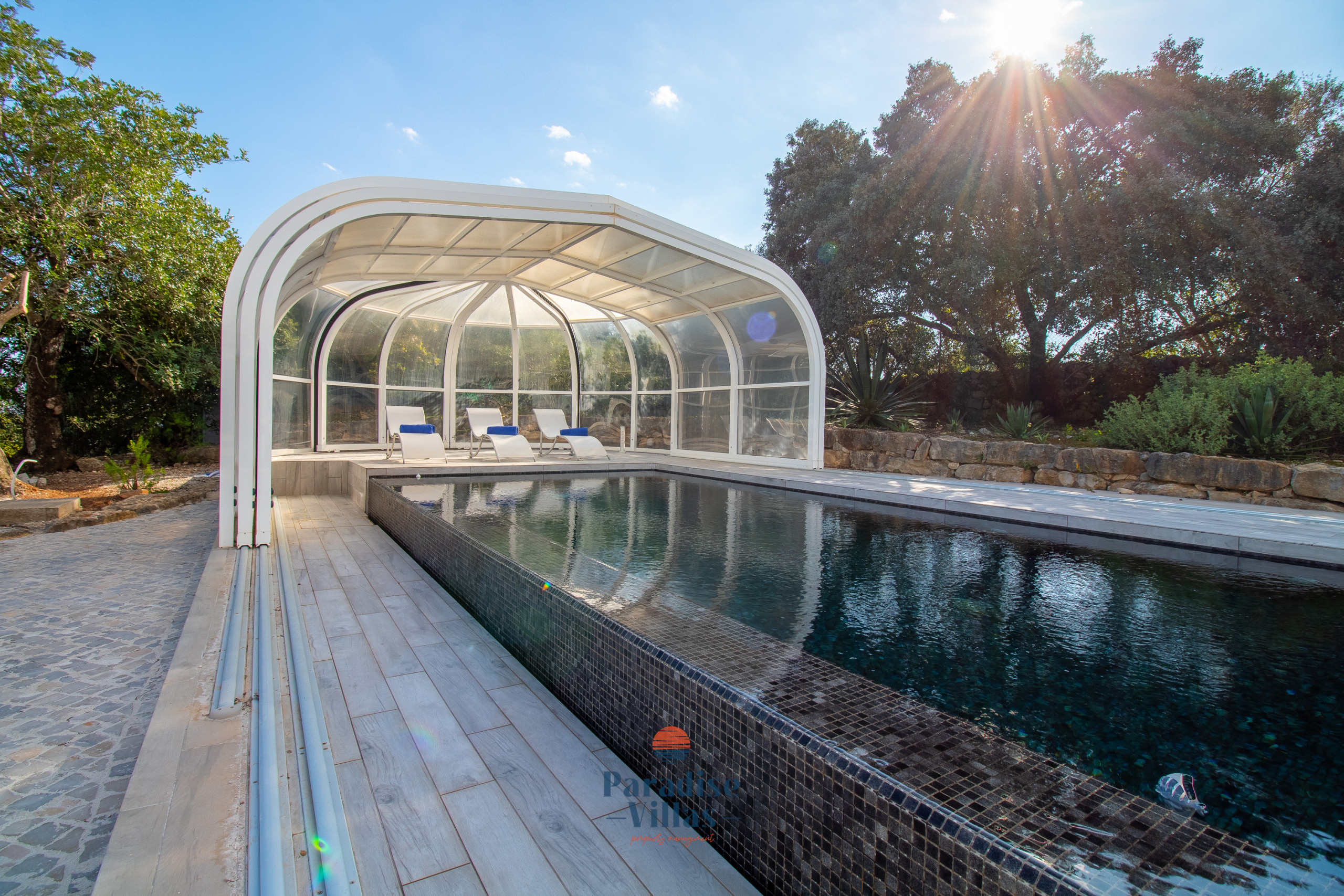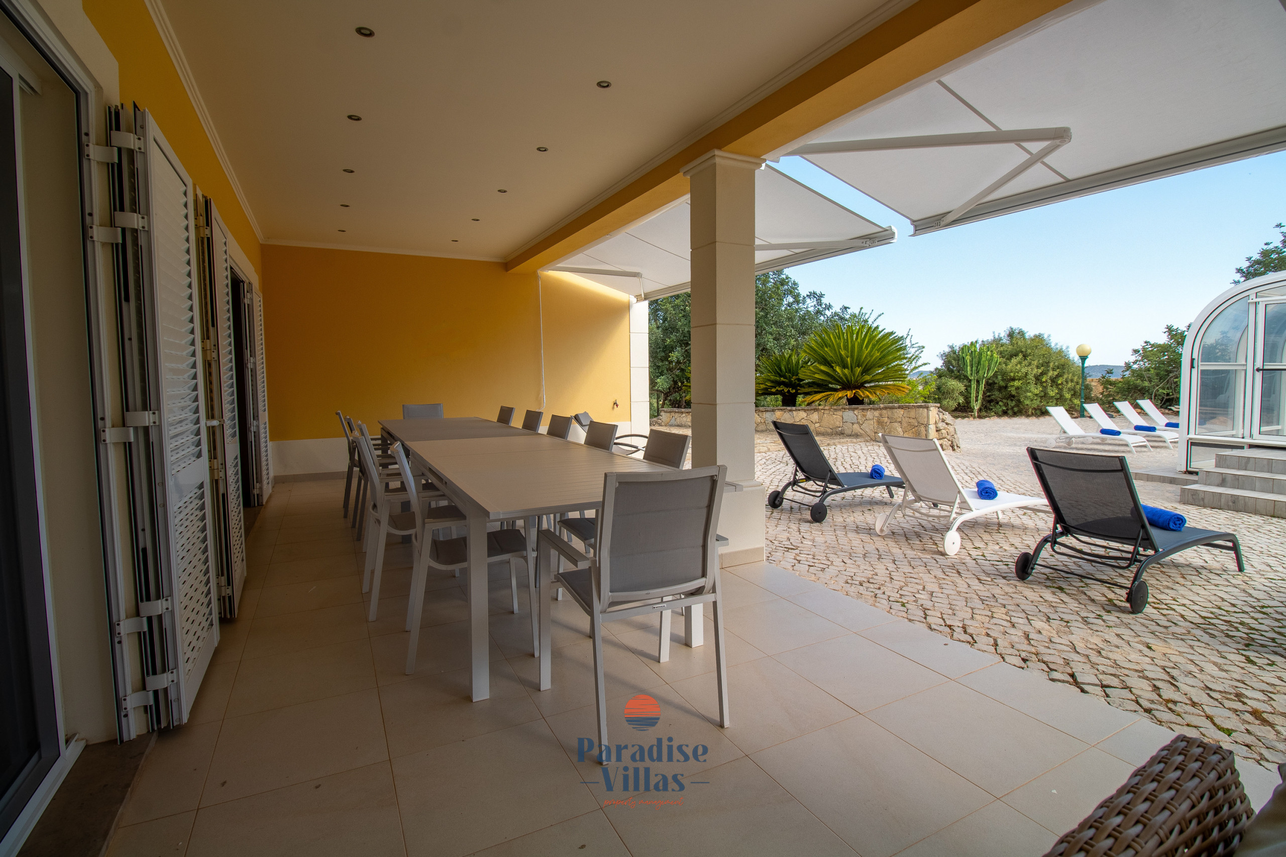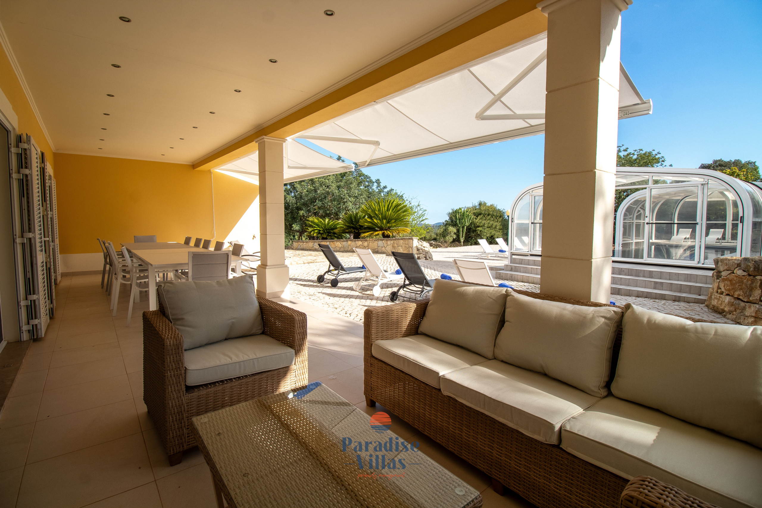 The outdoor area features a large table for outdoor dining, garden sofas, sun loungers, and a private pool that can be opened or closed.