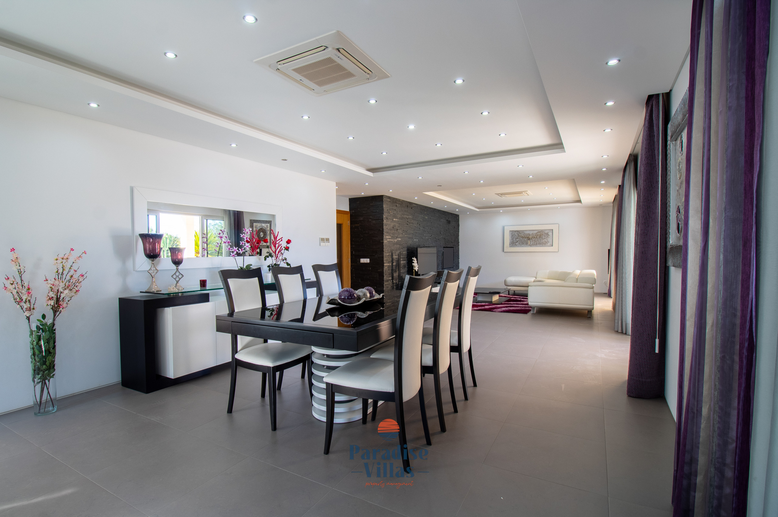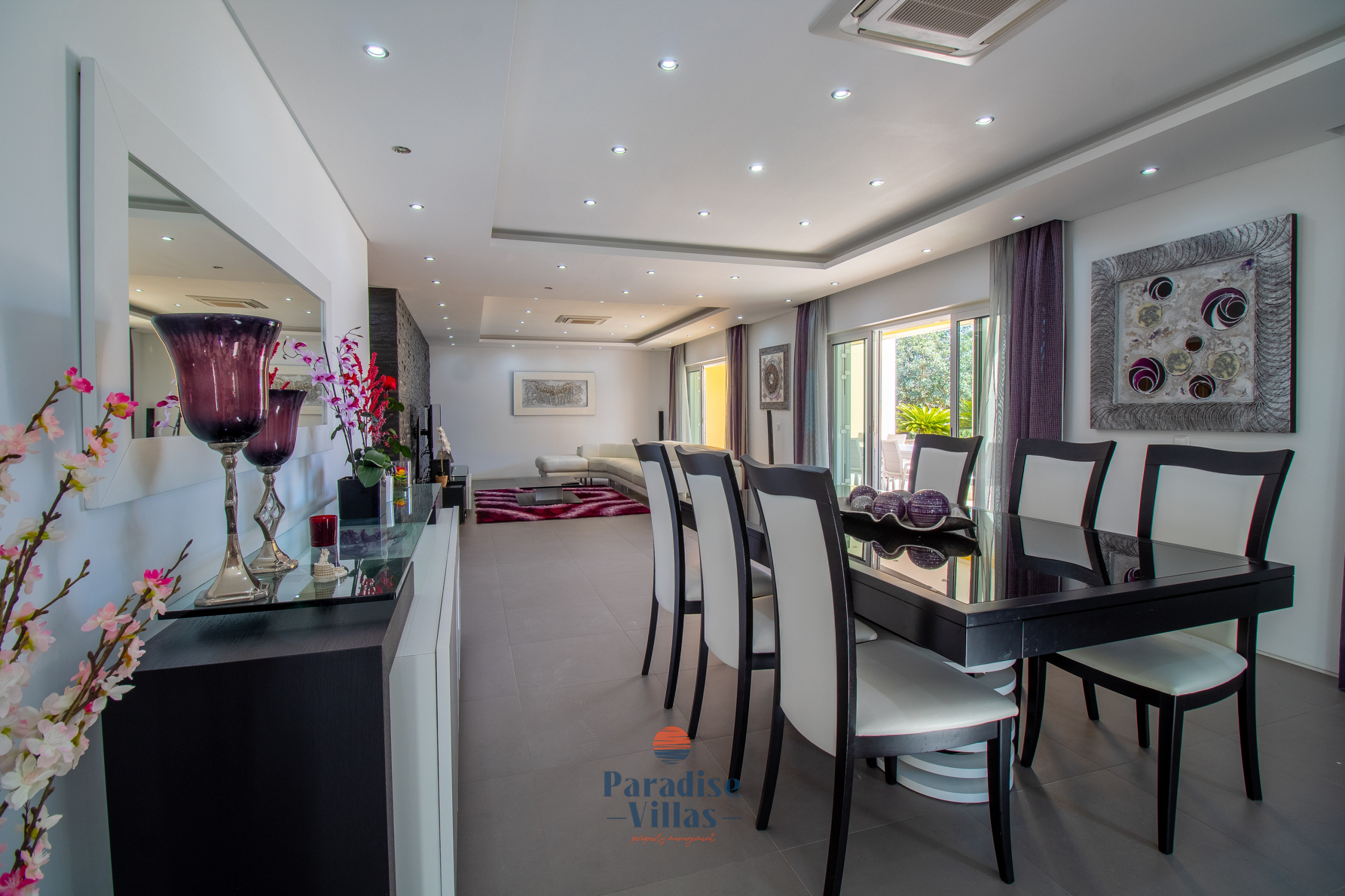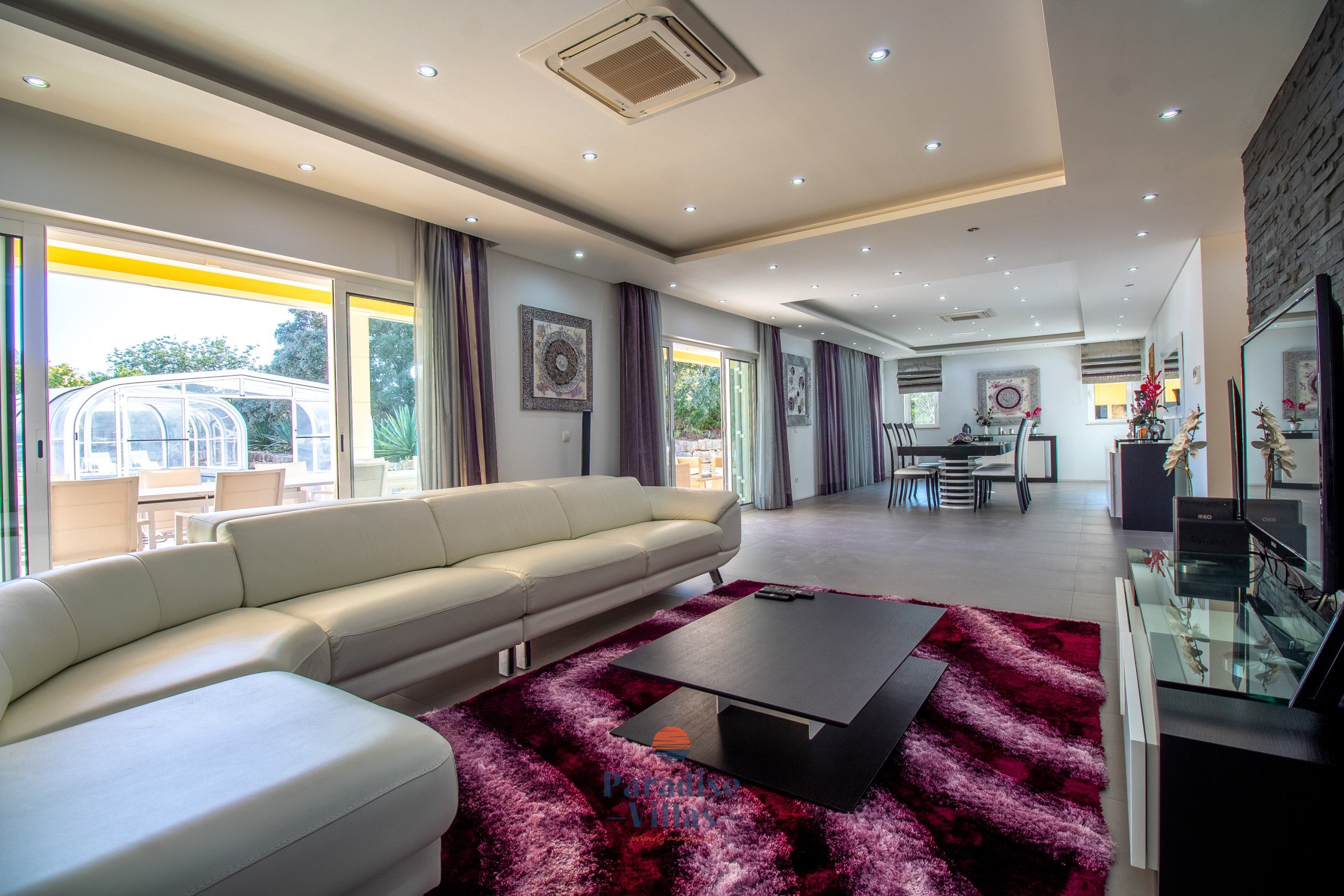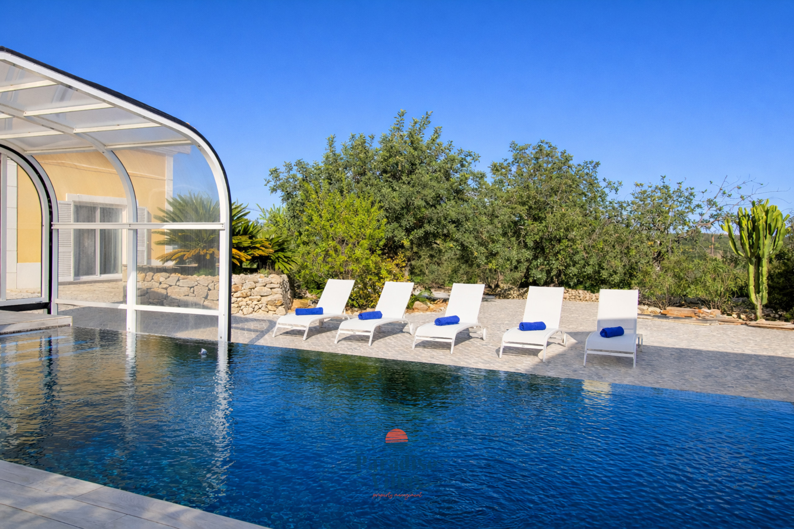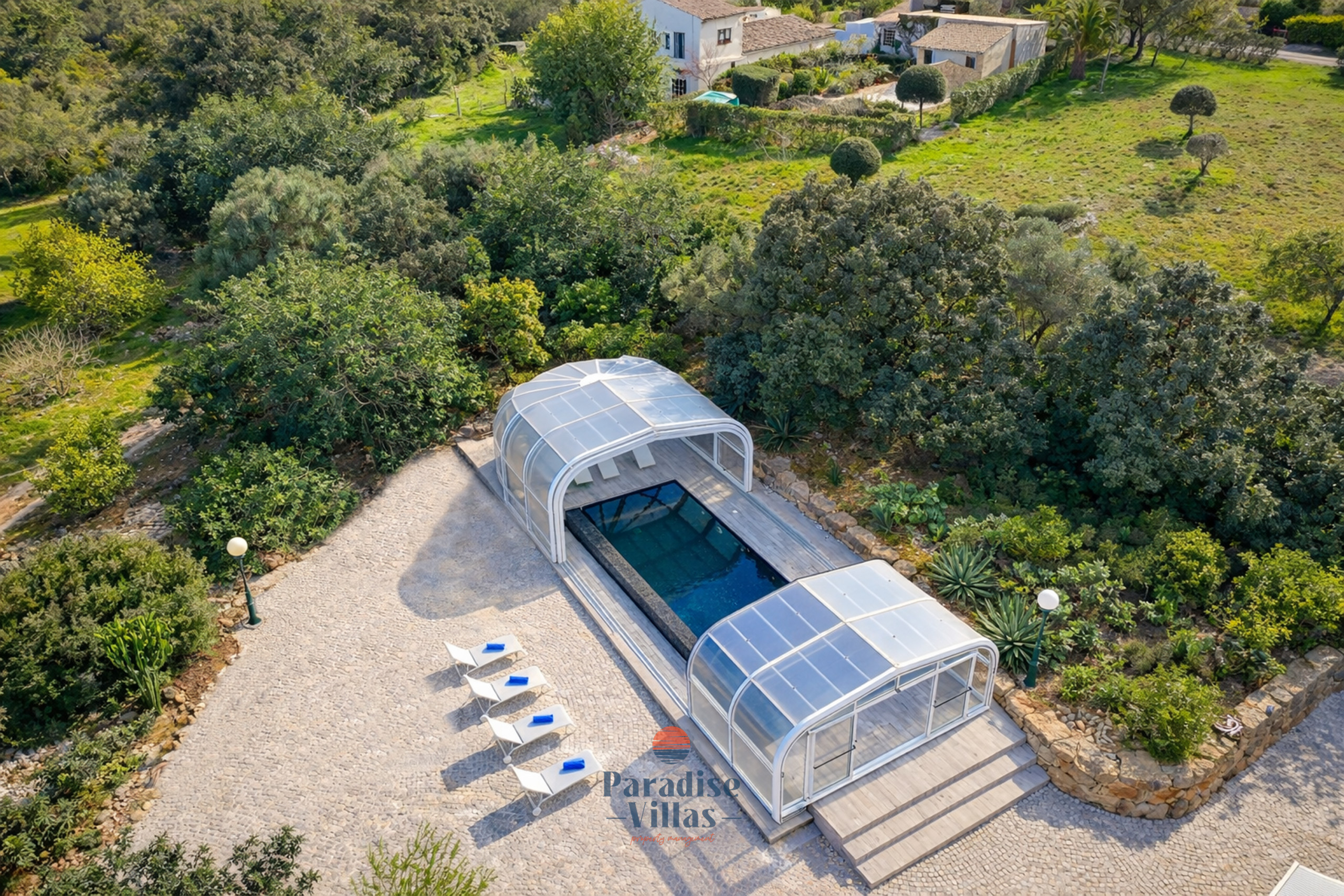 The outdoor area features a large table for outdoor dining, garden sofas, sun loungers, and a private pool that can be opened or closed.
