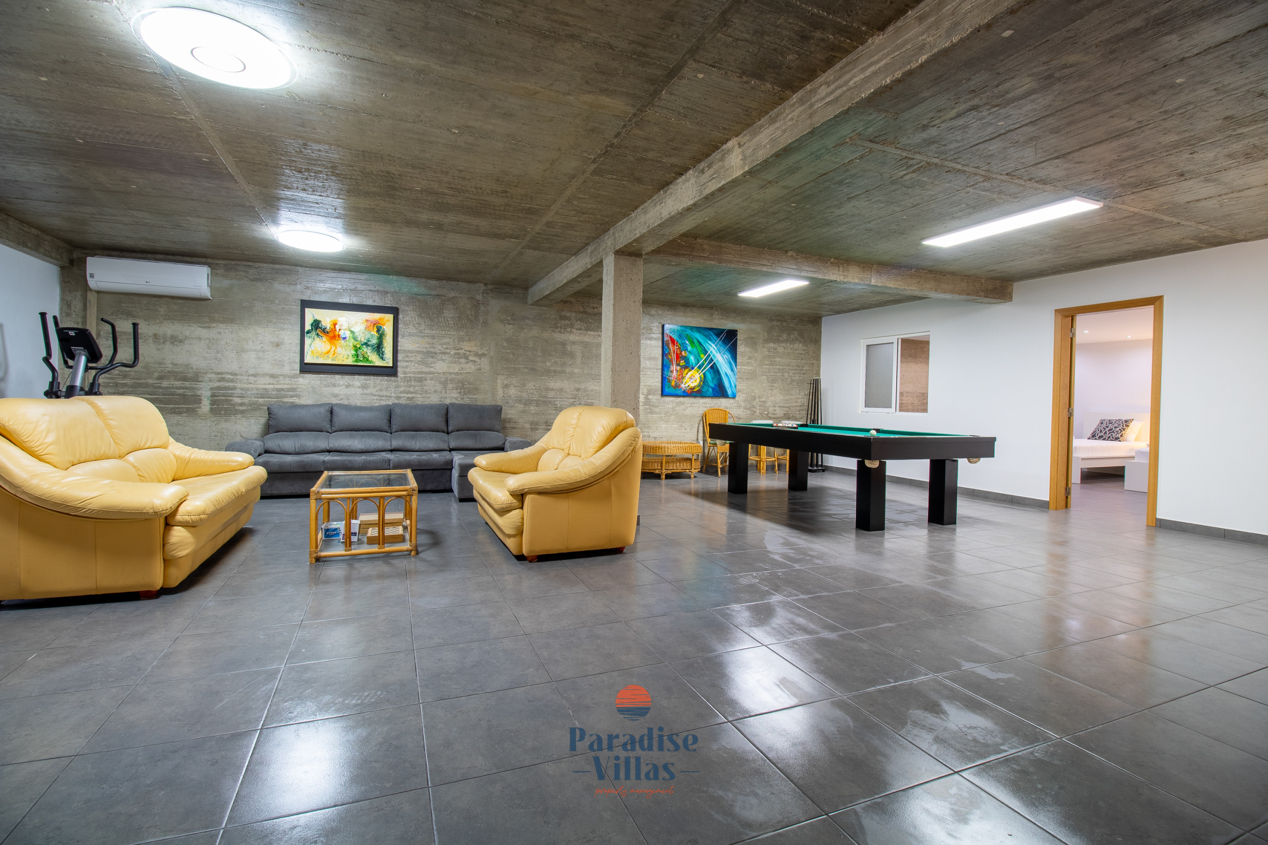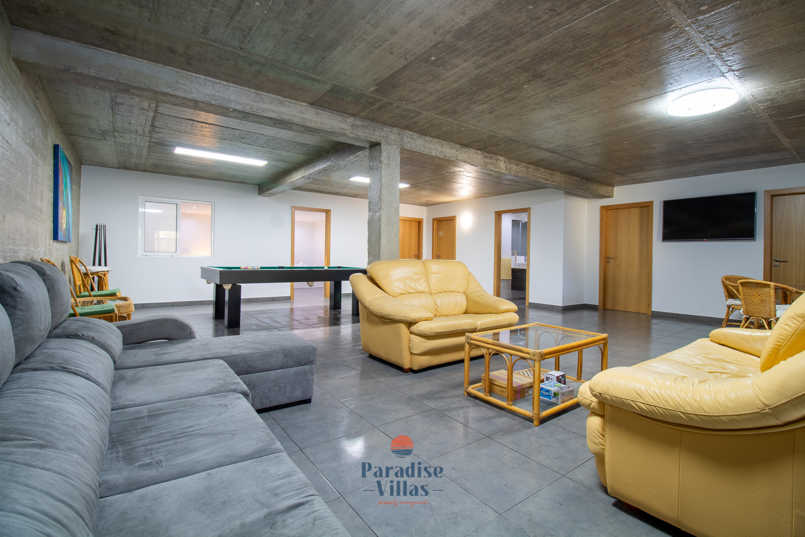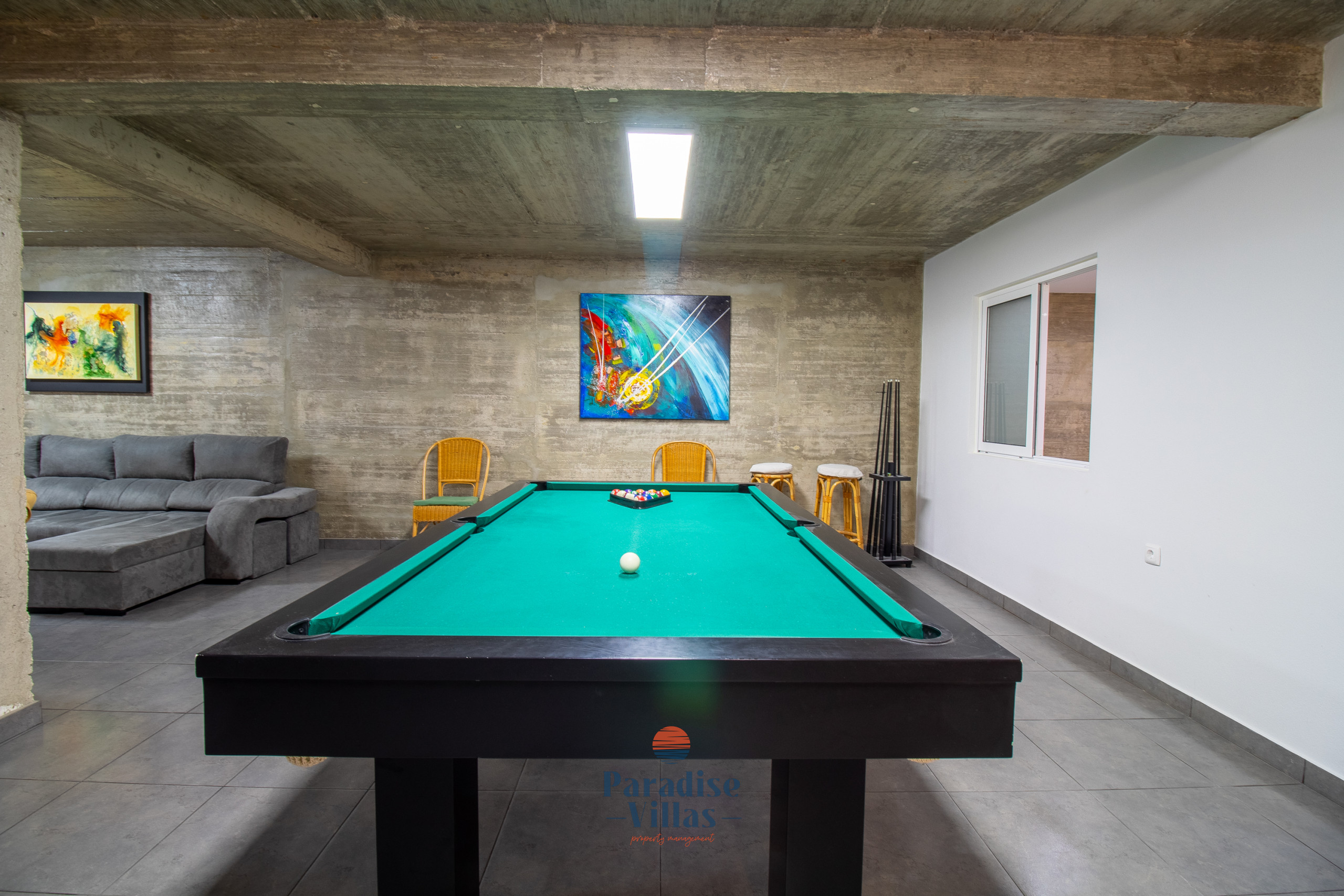 On the lower floor, there are 2 additional bedrooms and a bathroom with a shower. This floor also has a second kitchen with a dining table, a games room with a snooker table and a comfortable sofa area for socialising.