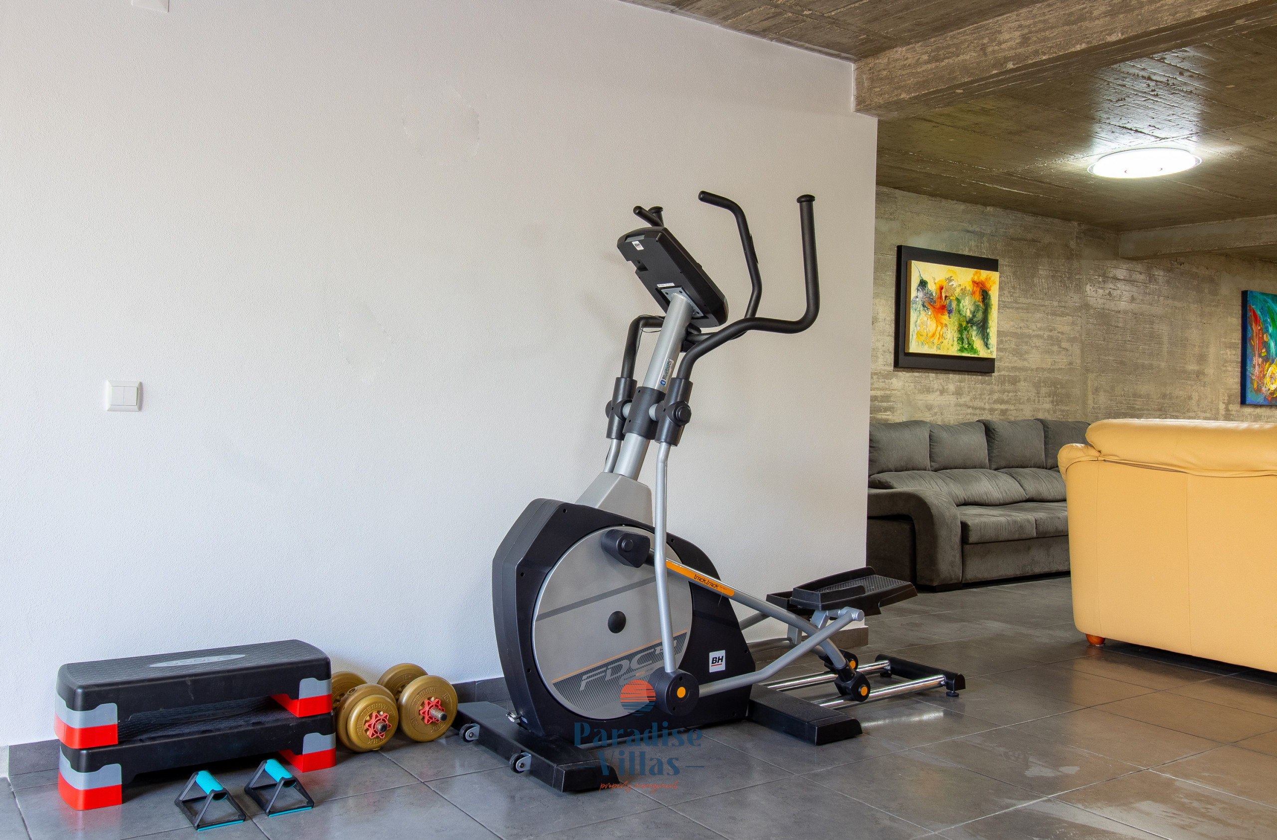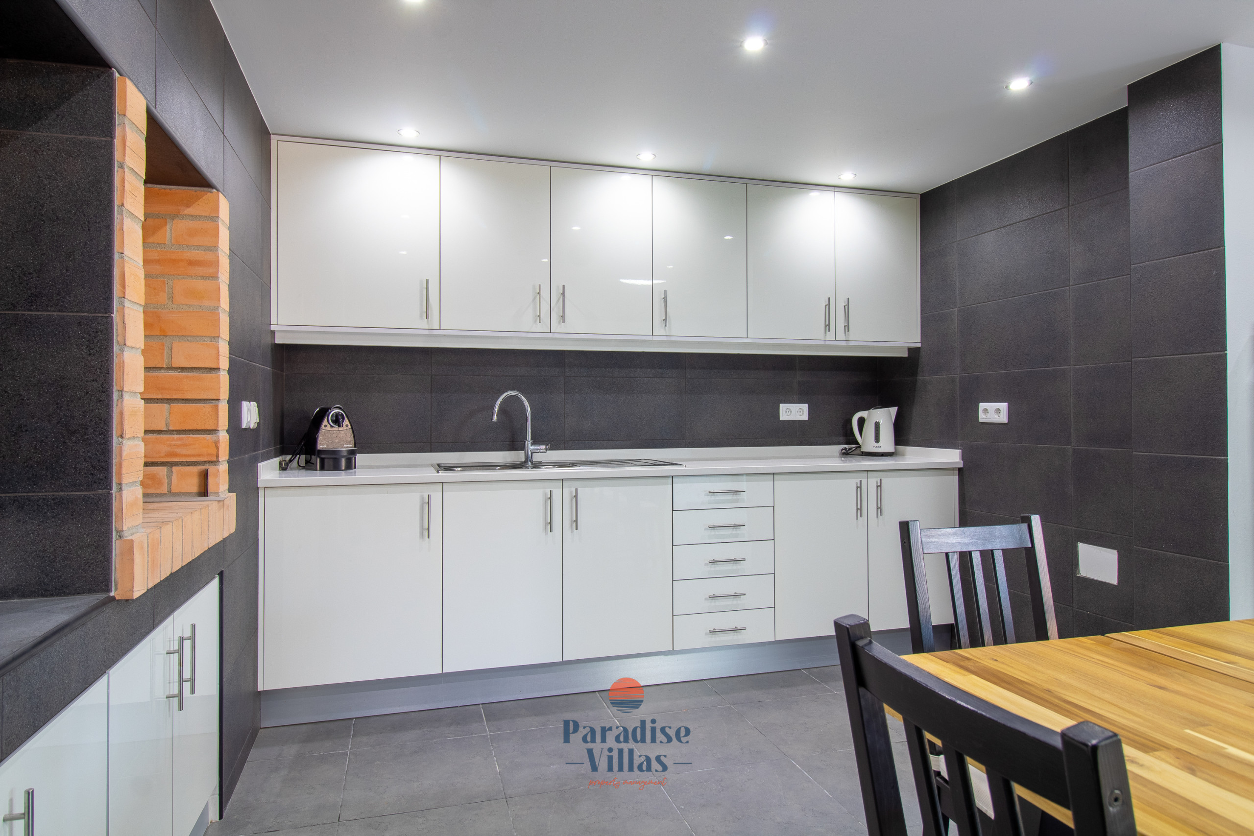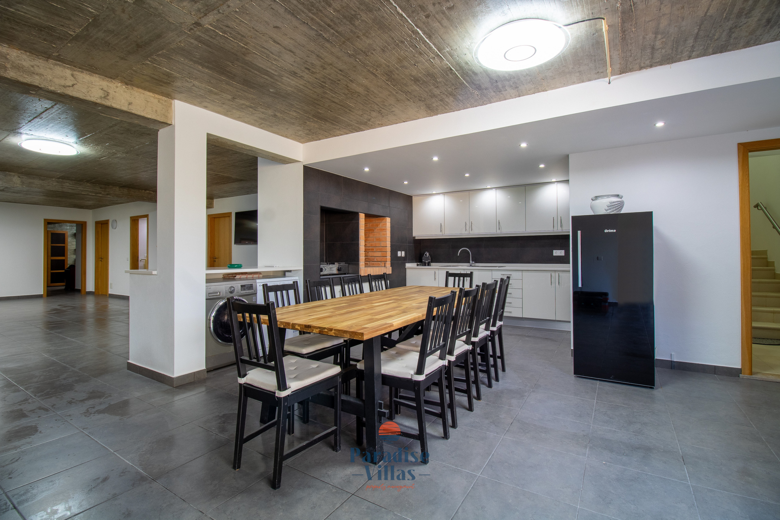 On the lower floor, there are 2 additional bedrooms and a bathroom with a shower. This floor also has a second kitchen with a dining table, a games room with a snooker table and a comfortable sofa area for socialising.